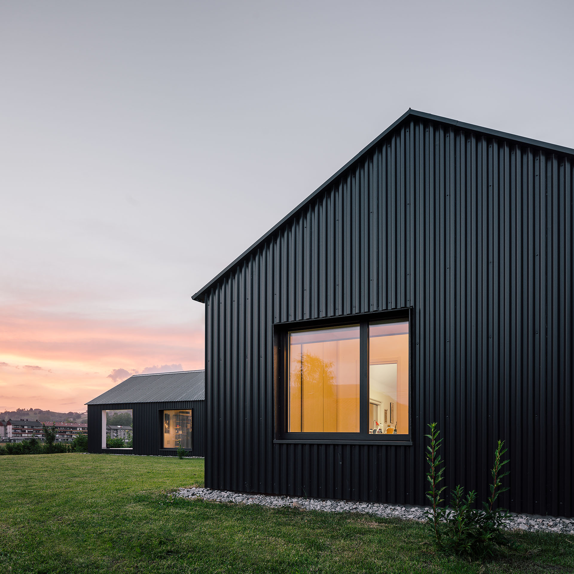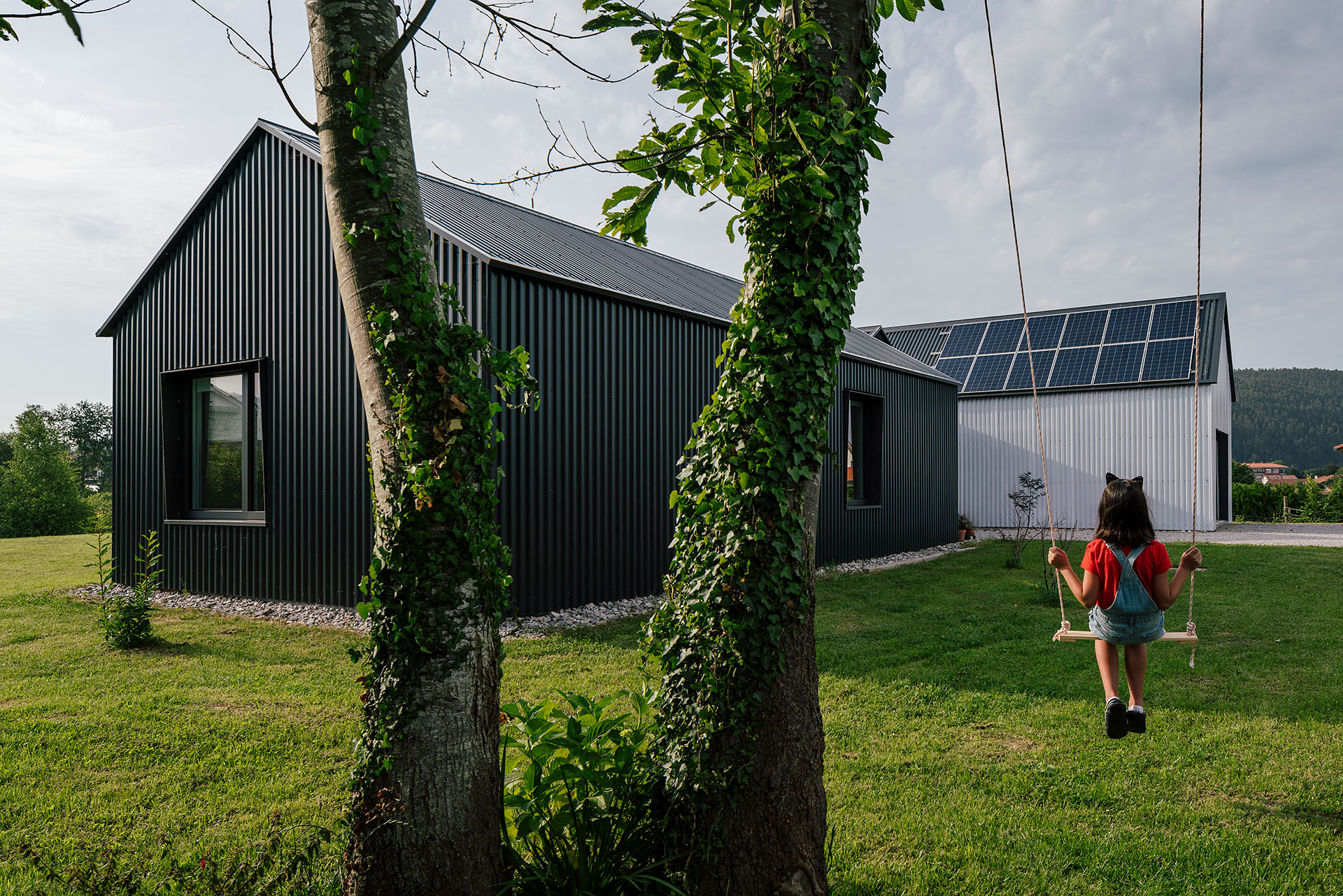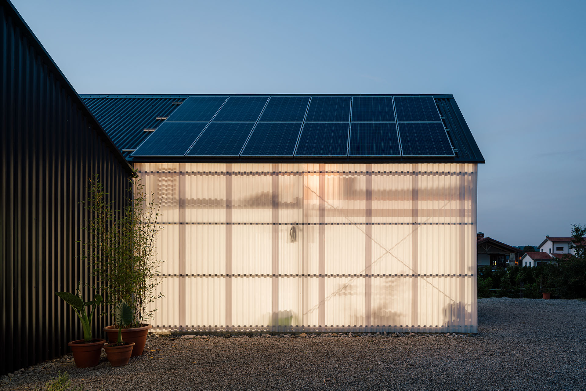 A nivel constructivo, se han empleado estructuras monolóticas de hormigón armado con alma de material aislante. Para la envolvente, un sistema de chapa grecada, tanto en cubierta como fachada, configura una solución capaz de minimizar el impacto en una vivienda poco compacta y garantiza una correcta durabilidad. Además de ser una solución con múltiples ventajas en cuanto a cuestiones económicas y técnicas, junto al volumen de garaje resuelto en metacrilato plegado, se consigue moldear una imagen que pretende dialogar con los invernaderos que colonizan las inmediaciones, así como las arquitecturas agrícolas que parecen estar destinadas a desaparecer. Con ello, también se pretende poner en valor este tipo de construcciones, pues no sólo replicando soluciones vernáculas se pueden proyectar nuevas construcciones que se integren correctamente en el entorno.