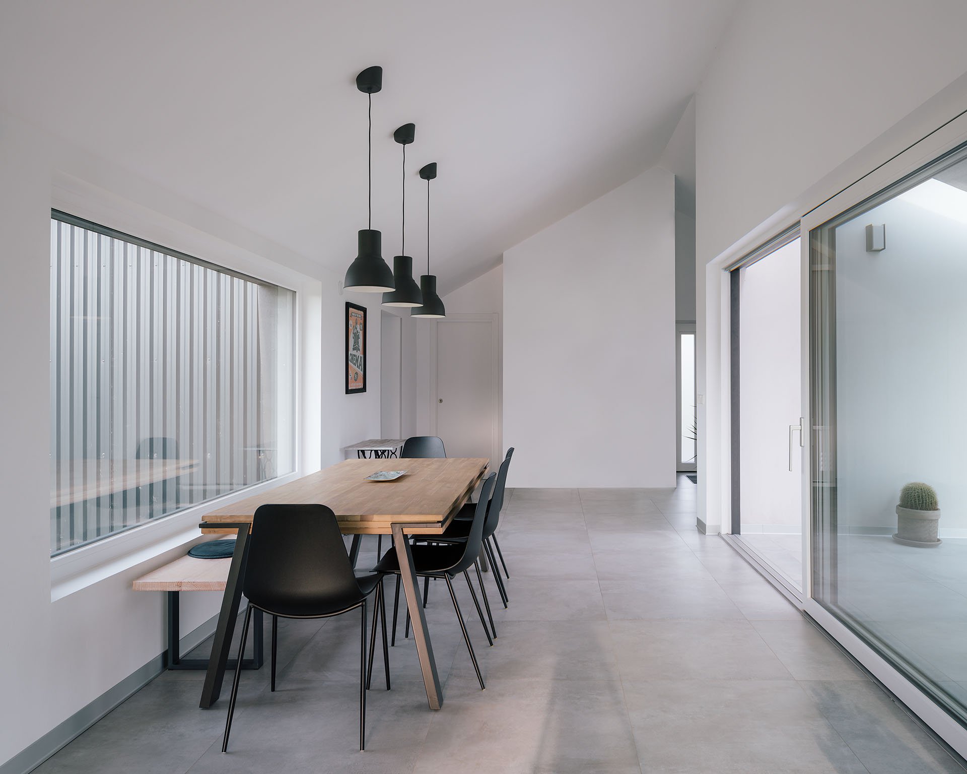 La vivienda se define en una única planta organizada en tres alas; una destinada a zona de descanso, otra con áreas comunes y una tercera pieza que alberga garaje y cocina. Dicha solución fragmenta el volumen total en tres piezas más pequeñas que buscan una adecuación a nivel de escala, así como una cierta flexibilidad necesaria para modelar distintos grados de privacidad o accesos desde la vía pública.