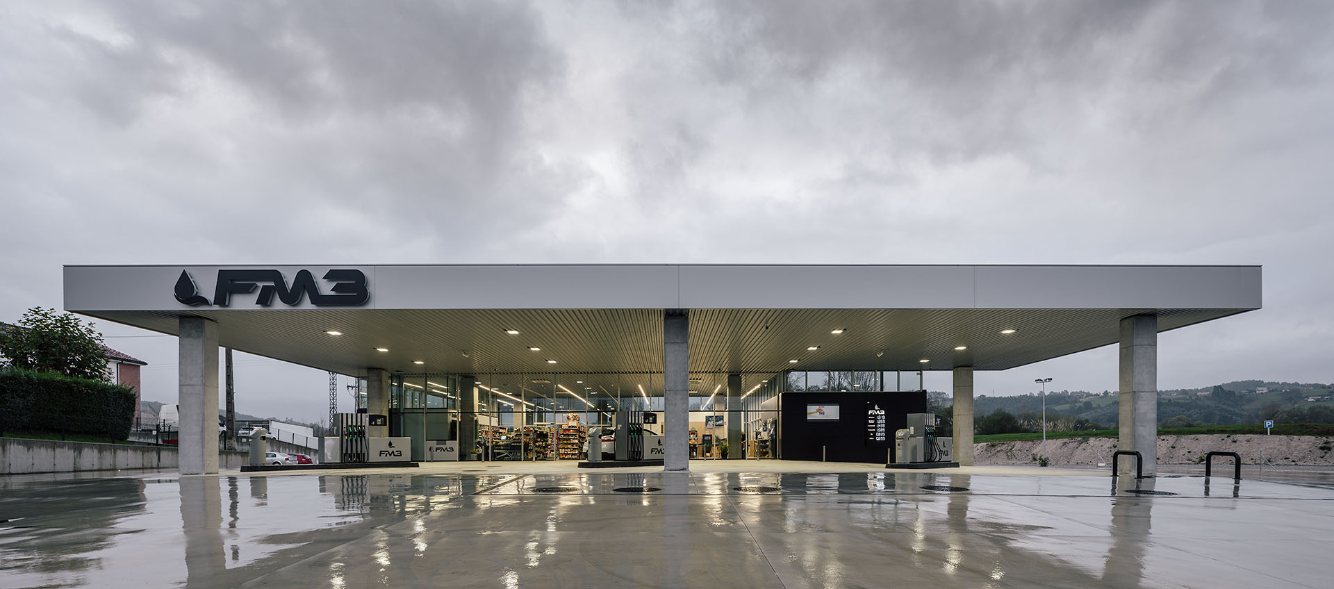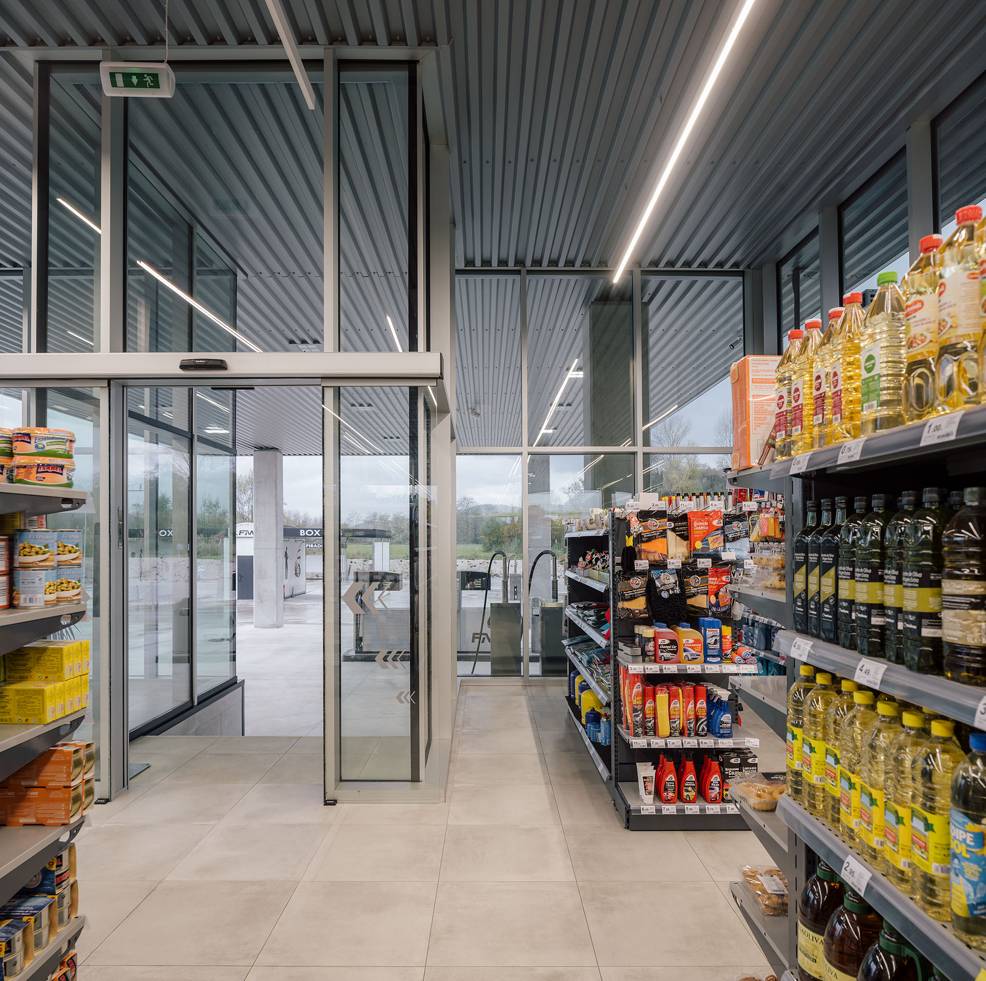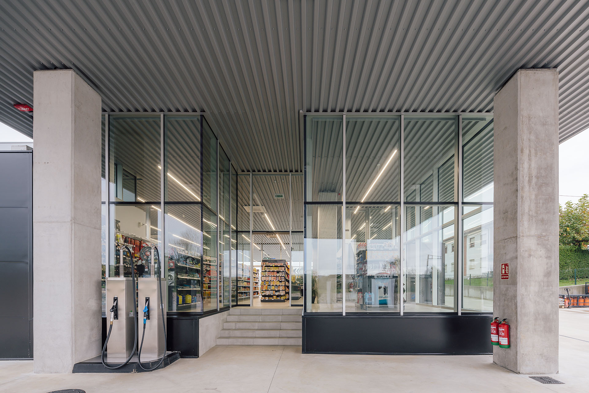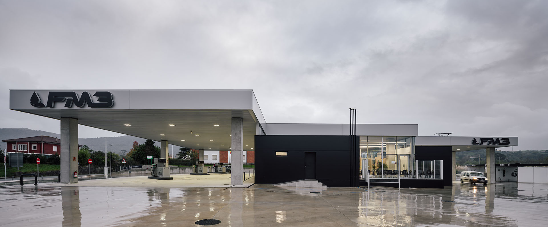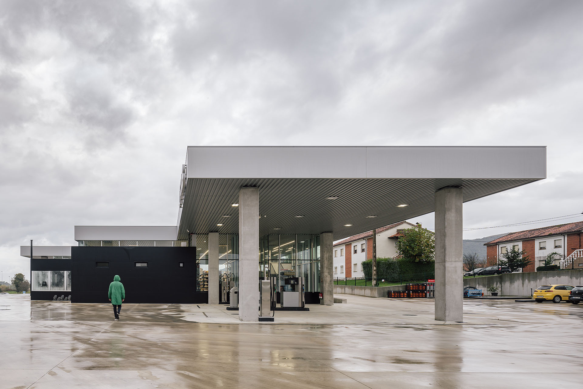 En el área central de la cubierta se organizan todas las piezas de servicios. El espacio principal viene definido por cuatro fachadas de muro cortina que buscan desmaterializarse y fundir el interior con el entorno, que cuenta vistas al paisaje natural que rodea en gran medida la gasolinera. En este volumen de vidrio se insertan tres cajas opacas que albergan servicios tales como aseos, cocina, instalaciones o almacén. Dos de ellas, se definen como volúmenes independientes con respecto a la cubierta principal y en sus techos se ubican lucernarios que permiten iluminar y ventilar de manera natural estas estancias. Sobre la caja ubicada en fachada sur, se integran las oficinas del conjunto a modo de panóptico, permitiendo vigilar todos los espacios del conjunto. Los volúmenes de cocina y almacén también cuentan con accesos independientes desde el exterior, lo que permite la descarga de producto de tienda y cafetería sin interferir con las circulaciones de los clientes. La caja de vidrio, con una altura libre de 4 metros, se organiza mediante el mobiliario articulando dos espacios; tienda y cafetería. Vinculada a la cafetería, una terraza permite hacer uso del exterior y desde la misma también se posibilita la entrada al edificio. Con esta solución, se define un total de tres accesos para clientes; desde terraza y desde ambas zonas de repostaje.