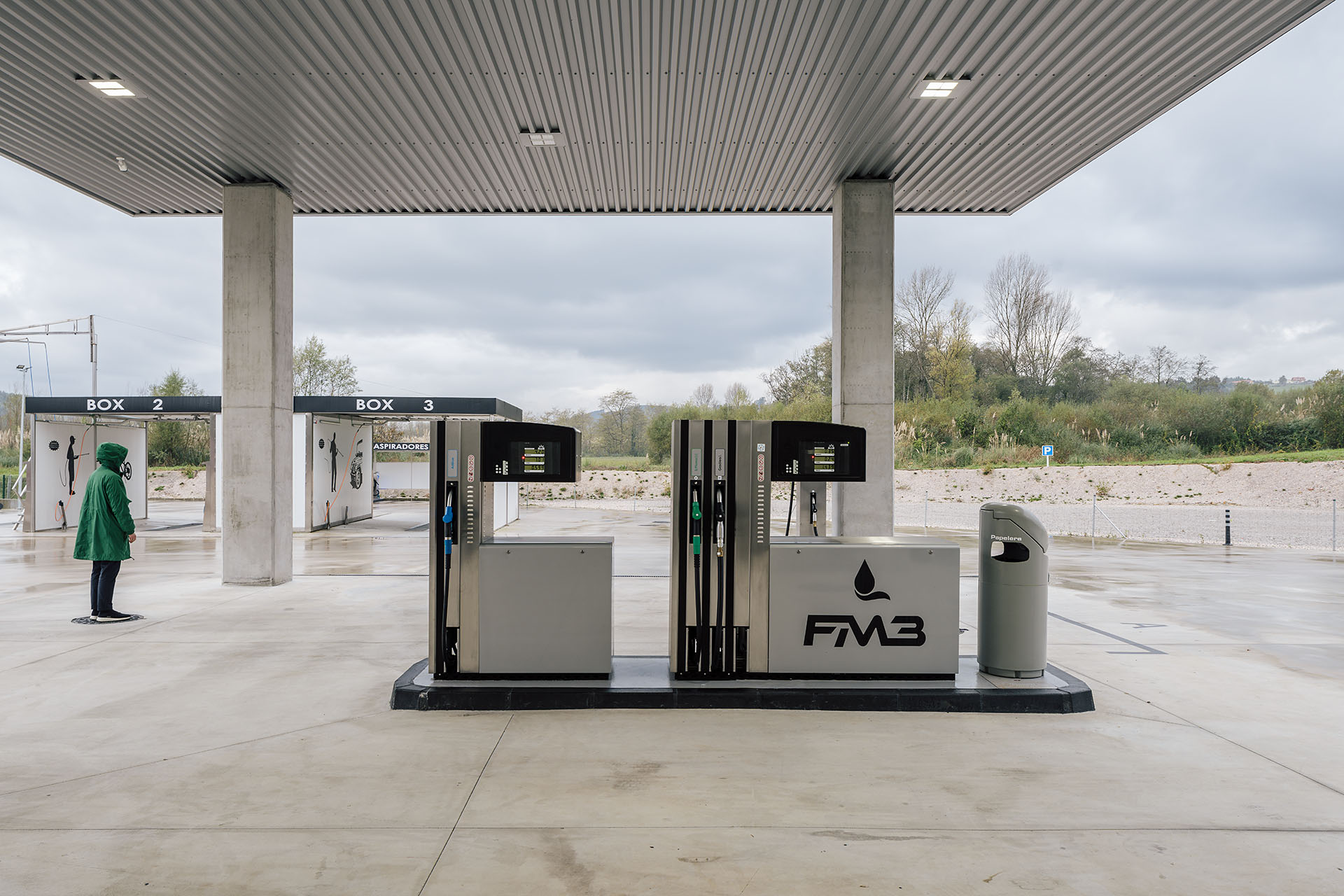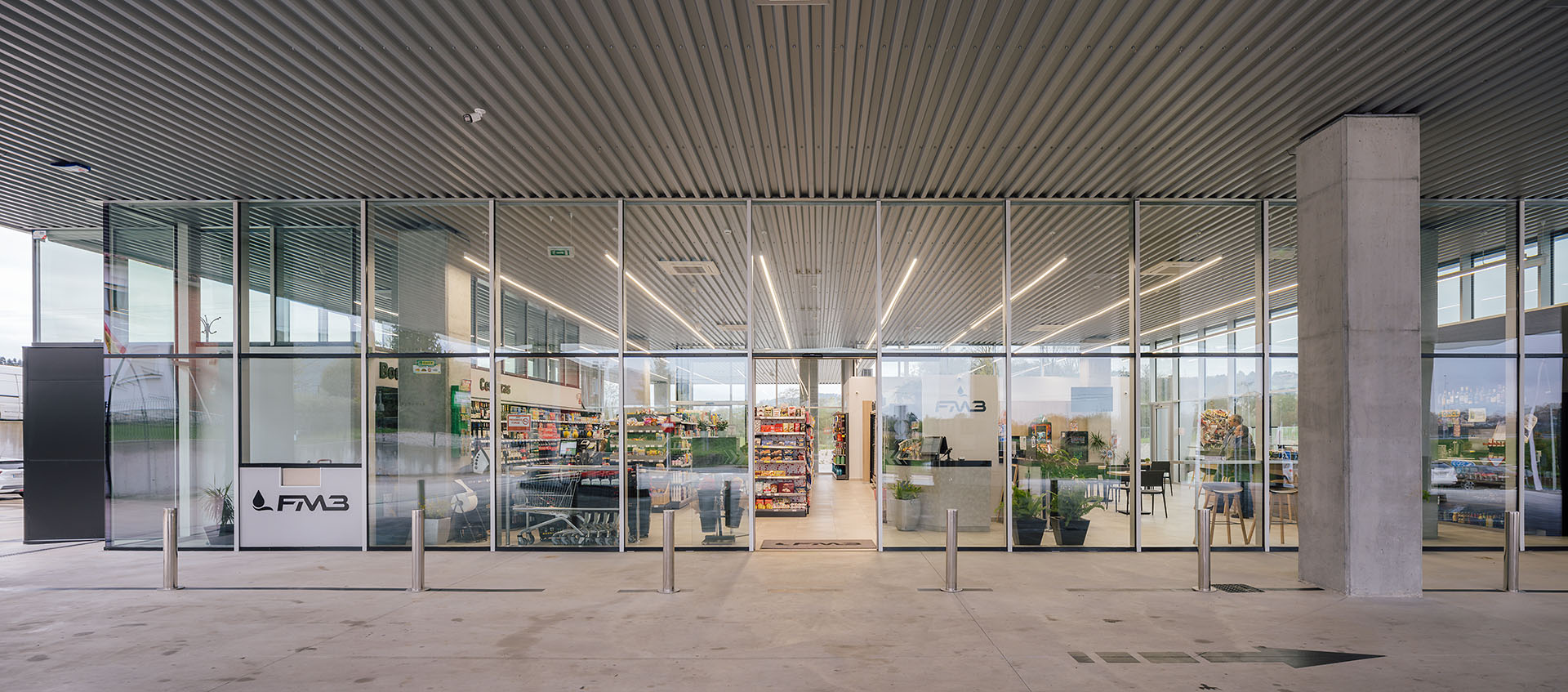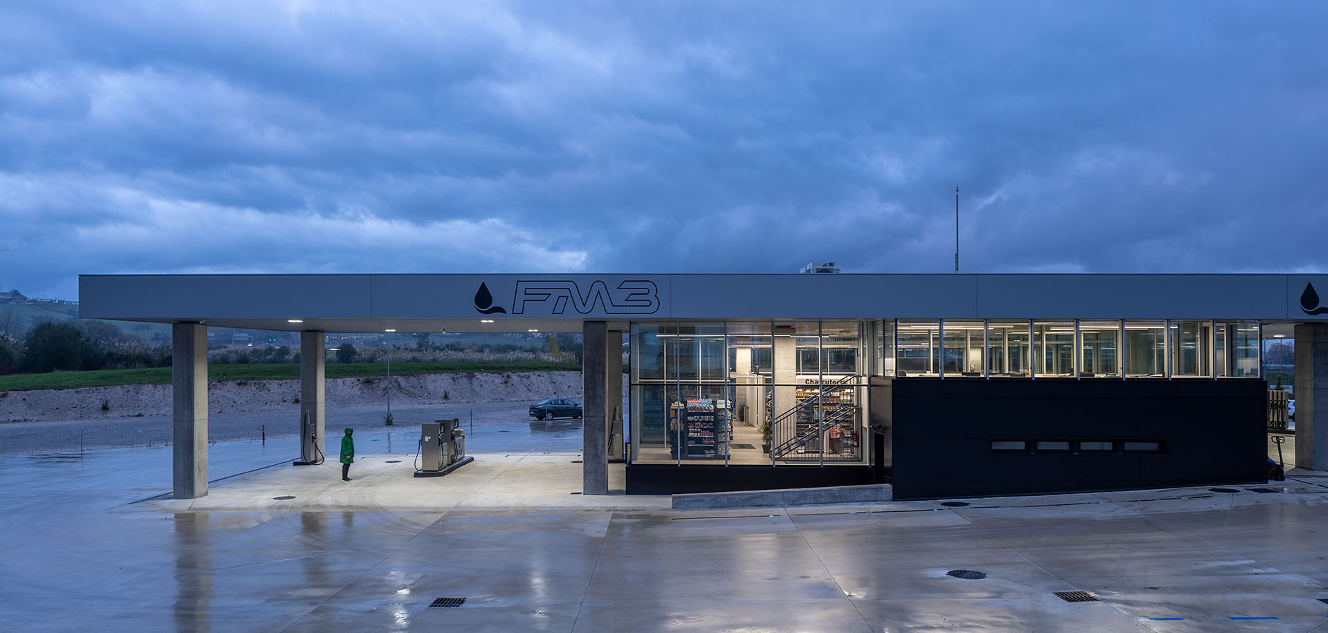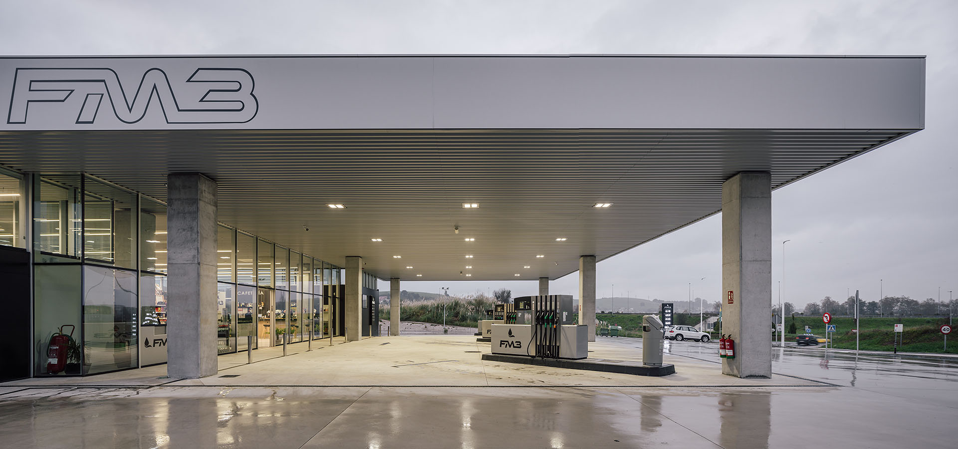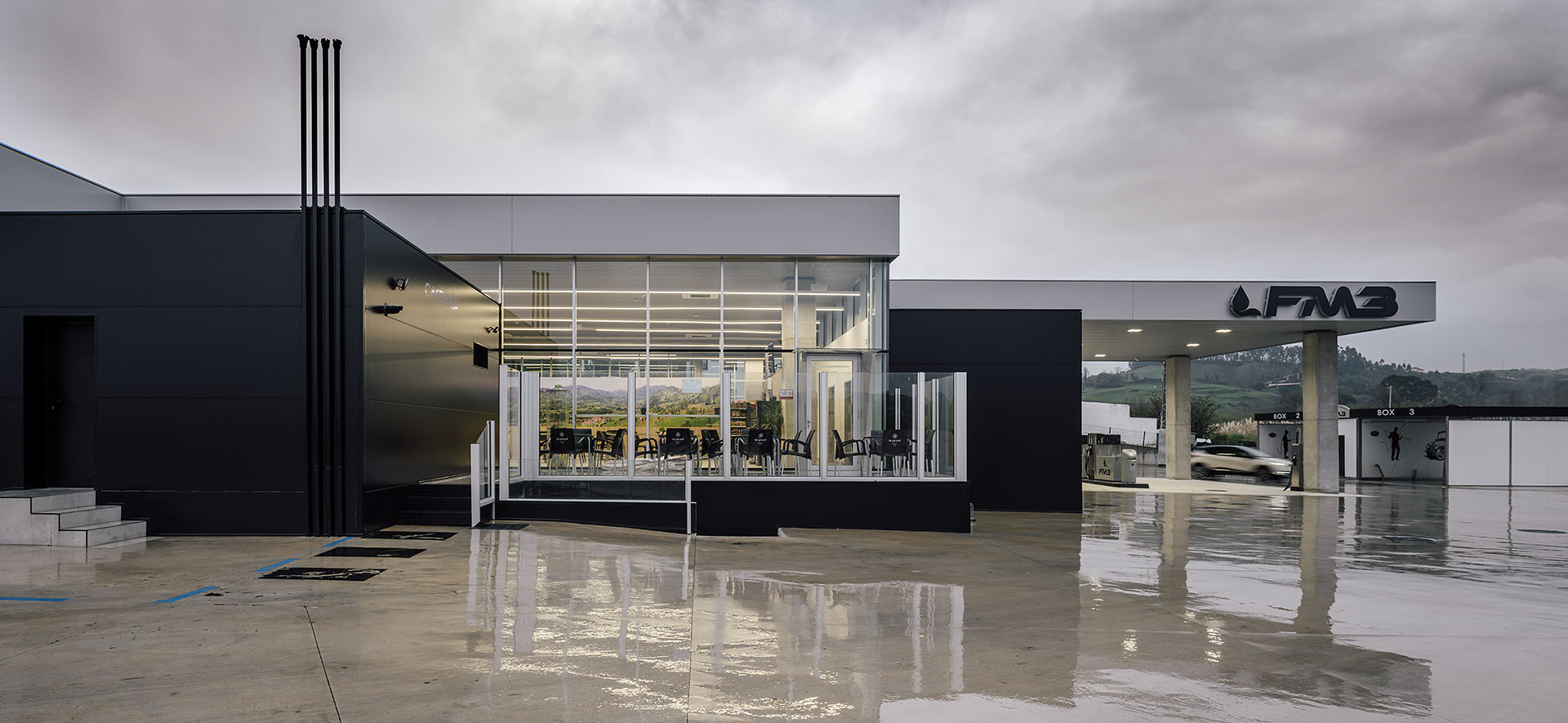 En el área central de la cubierta se organizan todas las piezas de servicios. El espacio principal viene definido por cuatro fachadas de muro cortina que buscan desmaterializarse y fundir el interior con el entorno, que cuenta vistas al paisaje natural que rodea en gran medida la gasolinera. En este volumen de vidrio se insertan tres cajas opacas que albergan servicios tales como aseos, cocina, instalaciones o almacén. Dos de ellas, se definen como volúmenes independientes con respecto a la cubierta principal y en sus techos se ubican lucernarios que permiten iluminar y ventilar de manera natural estas estancias. Sobre la caja ubicada en fachada sur, se integran las oficinas del conjunto a modo de panóptico, permitiendo vigilar todos los espacios del conjunto. Los volúmenes de cocina y almacén también cuentan con accesos independientes desde el exterior, lo que permite la descarga de producto de tienda y cafetería sin interferir con las circulaciones de los clientes. La caja de vidrio, con una altura libre de 4 metros, se organiza mediante el mobiliario articulando dos espacios; tienda y cafetería. Vinculada a la cafetería, una terraza permite hacer uso del exterior y desde la misma también se posibilita la entrada al edificio. Con esta solución, se define un total de tres accesos para clientes; desde terraza y desde ambas zonas de repostaje.