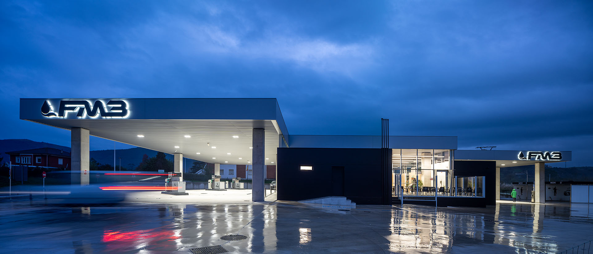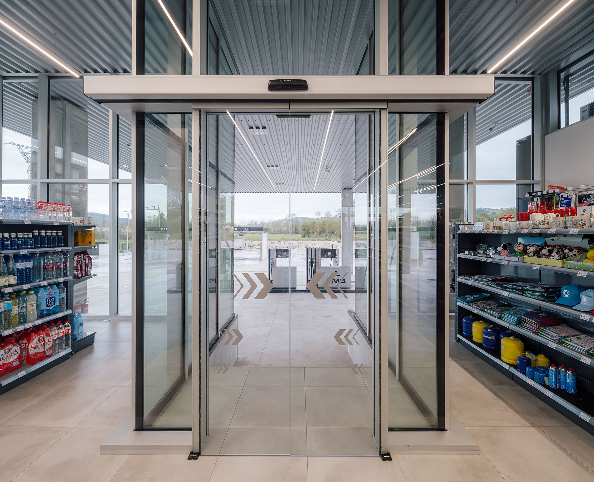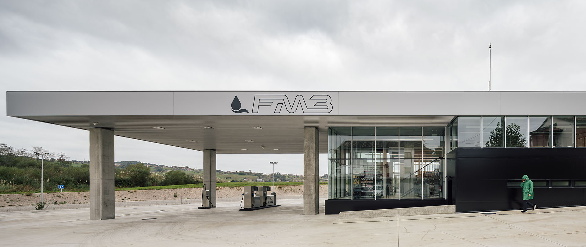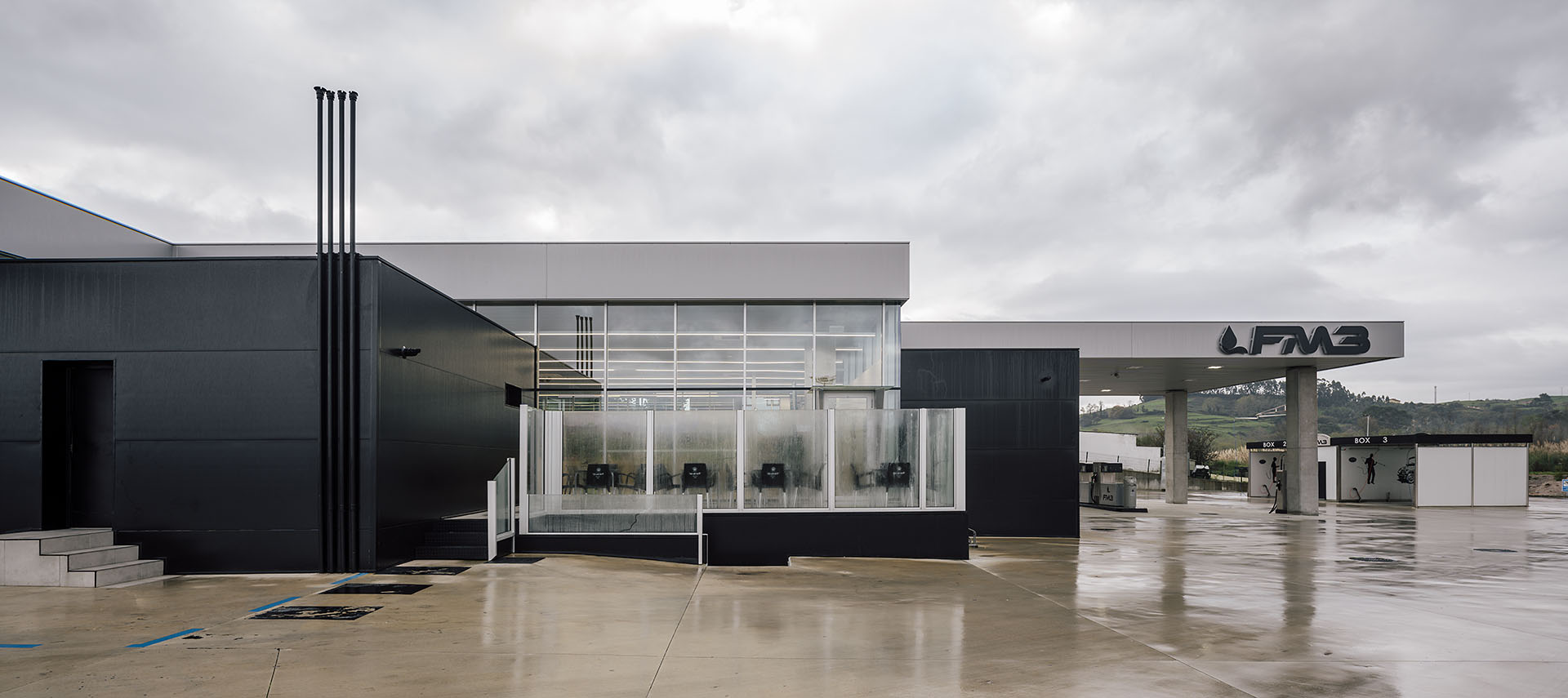 En el área central de la cubierta se organizan todas las piezas de servicios. El espacio principal viene definido por cuatro fachadas de muro cortina que buscan desmaterializarse y fundir el interior con el entorno, que cuenta vistas al paisaje natural que rodea en gran medida la gasolinera. En este volumen de vidrio se insertan tres cajas opacas que albergan servicios tales como aseos, cocina, instalaciones o almacén. Dos de ellas, se definen como volúmenes independientes con respecto a la cubierta principal y en sus techos se ubican lucernarios que permiten iluminar y ventilar de manera natural estas estancias. Sobre la caja ubicada en fachada sur, se integran las oficinas del conjunto a modo de panóptico, permitiendo vigilar todos los espacios del conjunto. Los volúmenes de cocina y almacén también cuentan con accesos independientes desde el exterior, lo que permite la descarga de producto de tienda y cafetería sin interferir con las circulaciones de los clientes. La caja de vidrio, con una altura libre de 4 metros, se organiza mediante el mobiliario articulando dos espacios; tienda y cafetería. Vinculada a la cafetería, una terraza permite hacer uso del exterior y desde la misma también se posibilita la entrada al edificio. Con esta solución, se define un total de tres accesos para clientes; desde terraza y desde ambas zonas de repostaje.