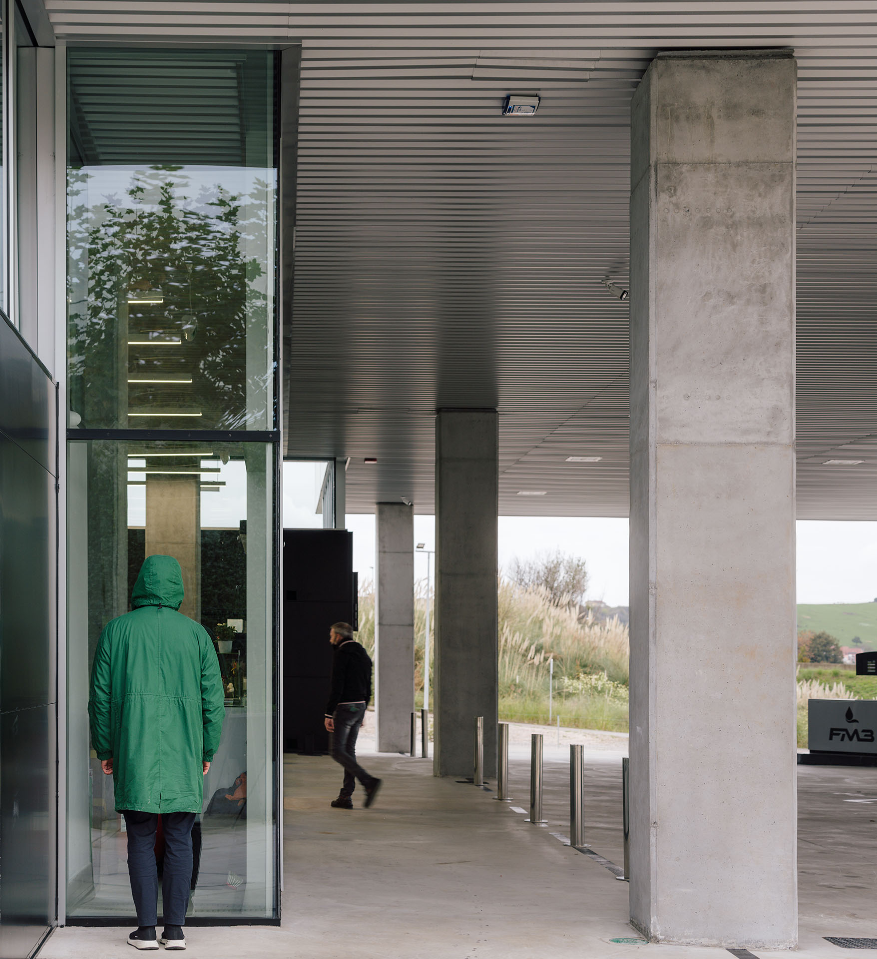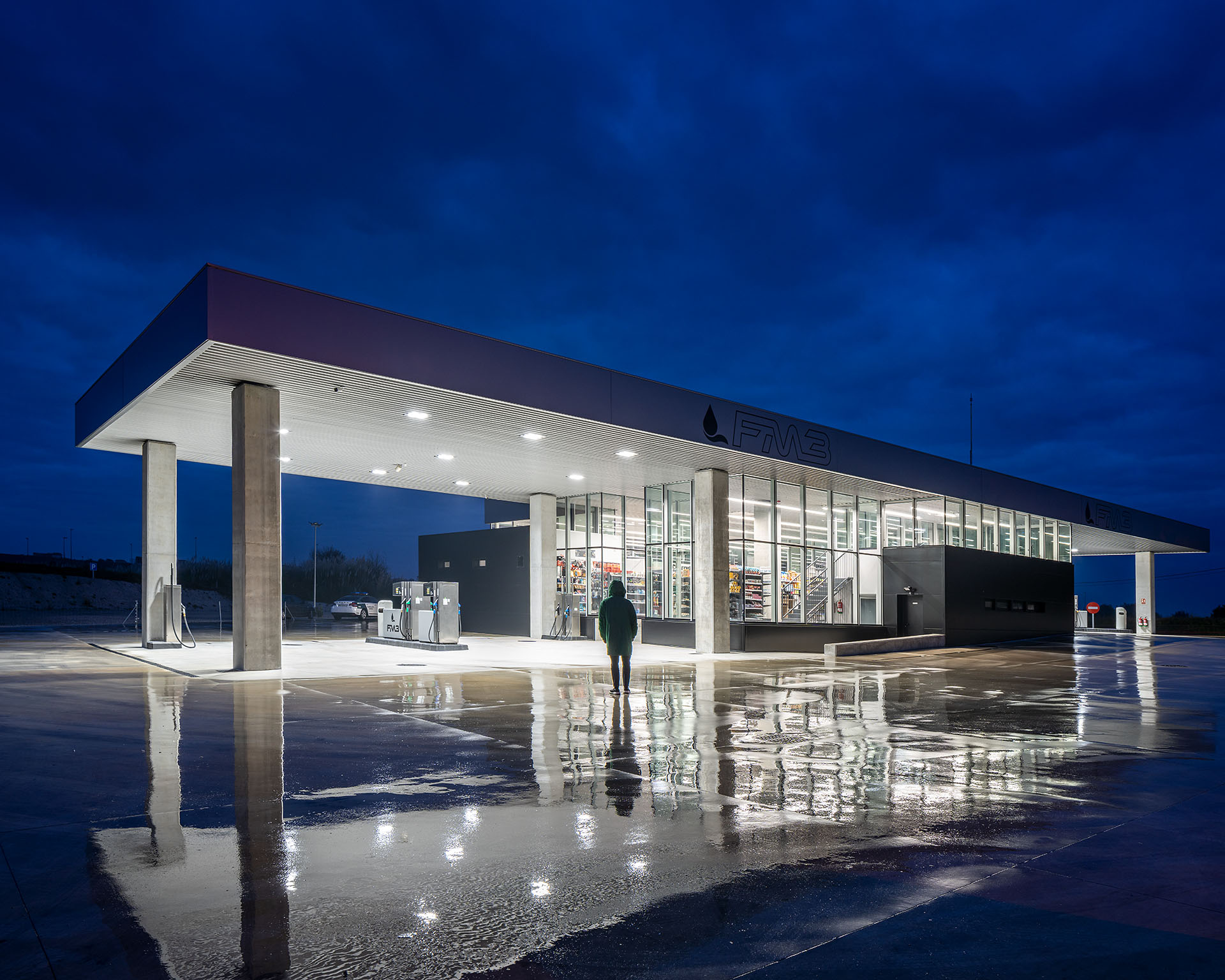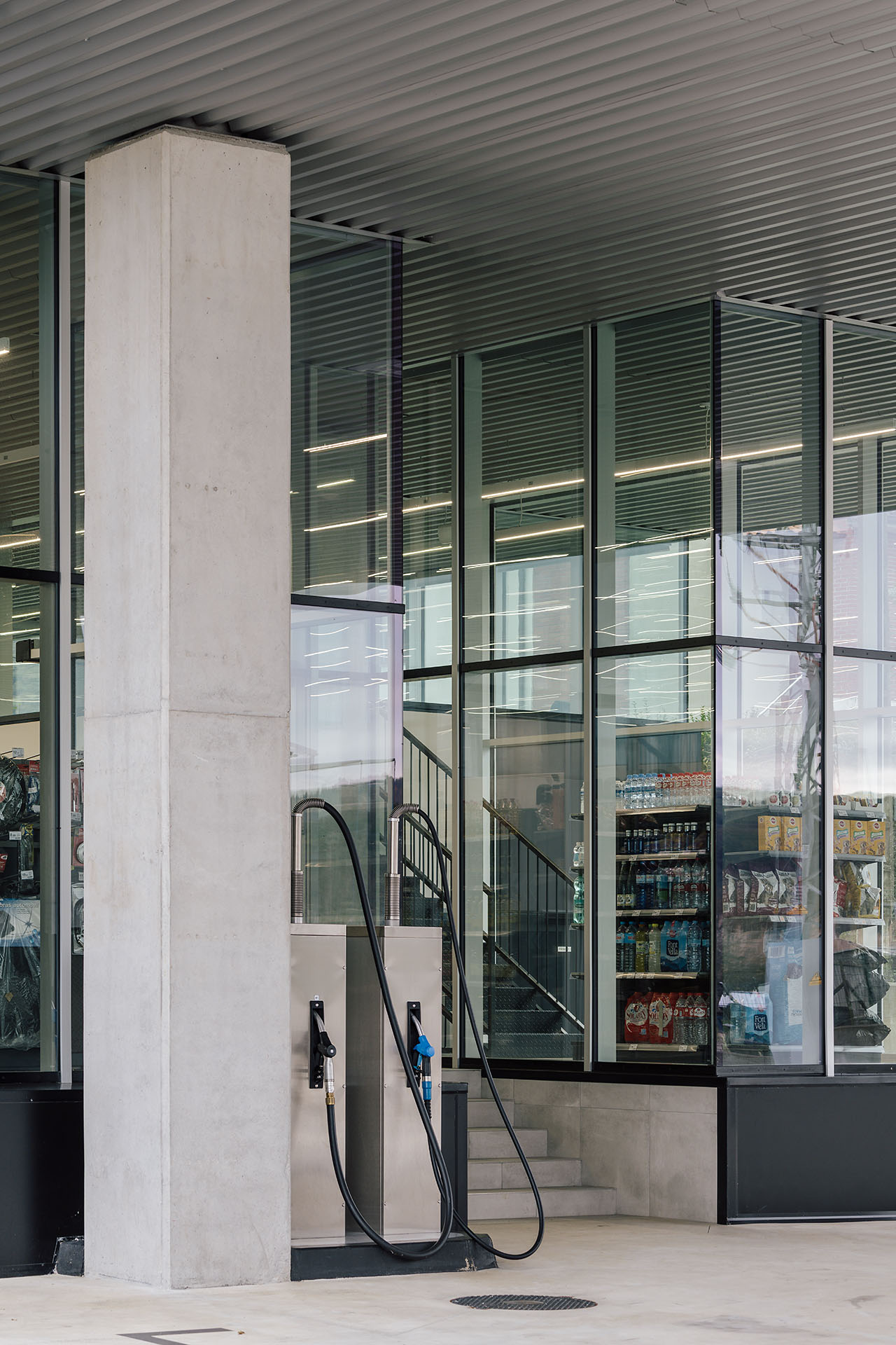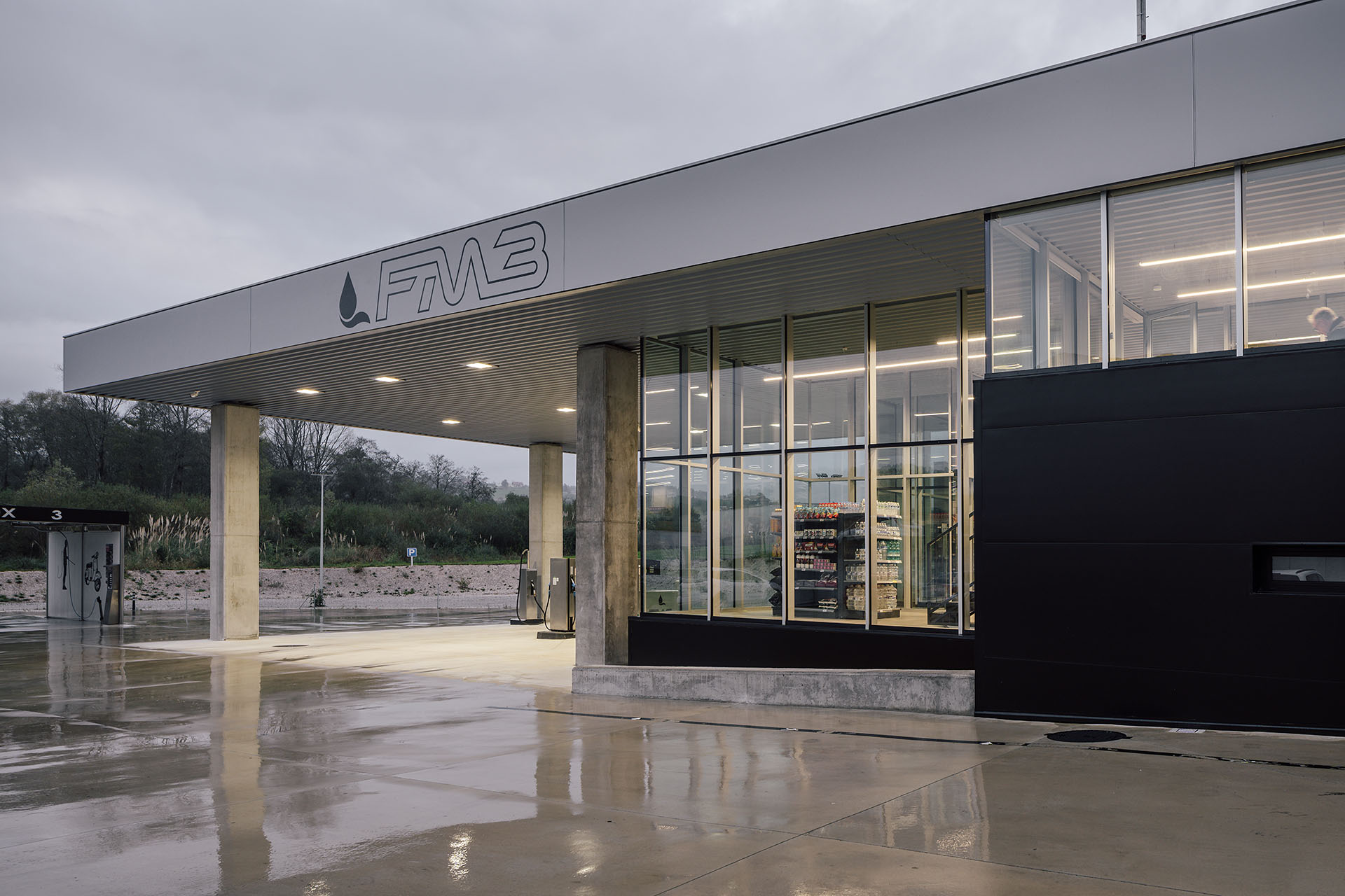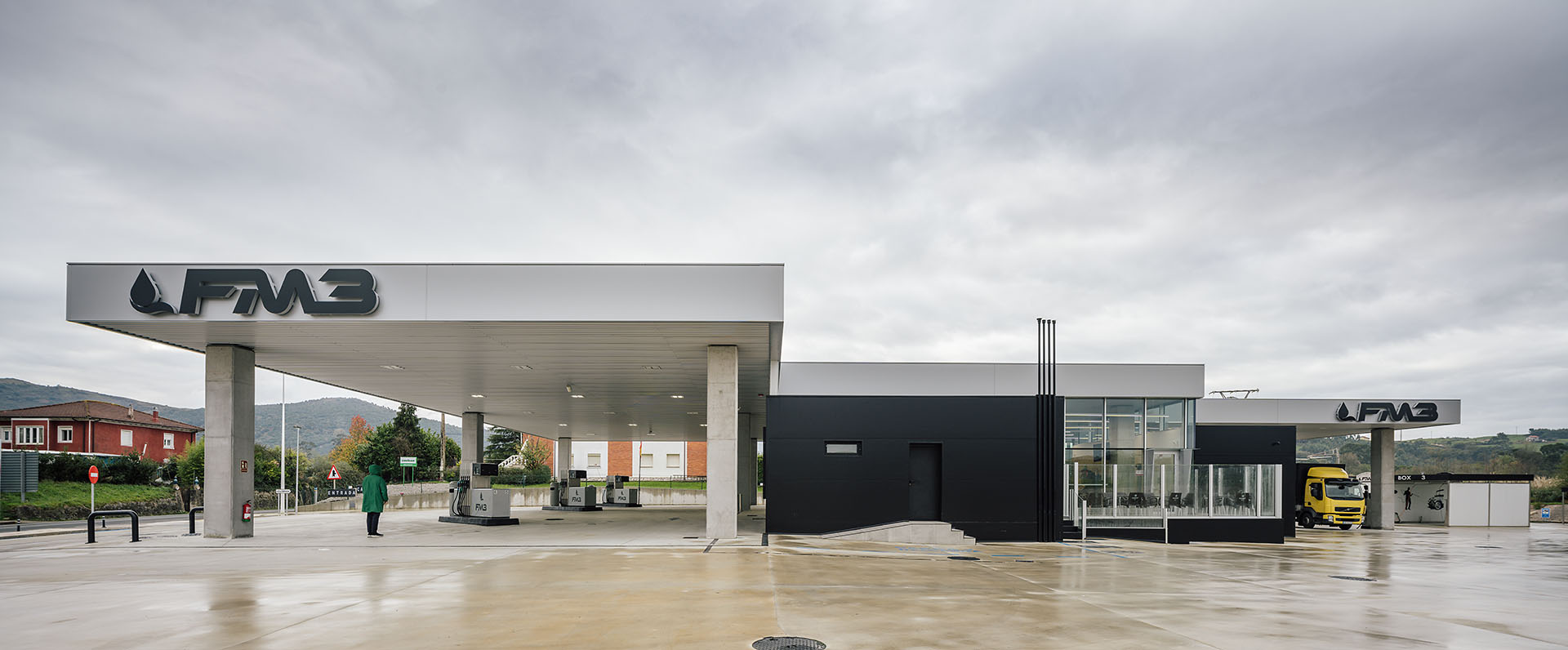 En el área central de la cubierta se organizan todas las piezas de servicios. El espacio principal viene definido por cuatro fachadas de muro cortina que buscan desmaterializarse y fundir el interior con el entorno, que cuenta vistas al paisaje natural que rodea en gran medida la gasolinera. En este volumen de vidrio se insertan tres cajas opacas que albergan servicios tales como aseos, cocina, instalaciones o almacén. Dos de ellas, se definen como volúmenes independientes con respecto a la cubierta principal y en sus techos se ubican lucernarios que permiten iluminar y ventilar de manera natural estas estancias. Sobre la caja ubicada en fachada sur, se integran las oficinas del conjunto a modo de panóptico, permitiendo vigilar todos los espacios del conjunto. Los volúmenes de cocina y almacén también cuentan con accesos independientes desde el exterior, lo que permite la descarga de producto de tienda y cafetería sin interferir con las circulaciones de los clientes. La caja de vidrio, con una altura libre de 4 metros, se organiza mediante el mobiliario articulando dos espacios; tienda y cafetería. Vinculada a la cafetería, una terraza permite hacer uso del exterior y desde la misma también se posibilita la entrada al edificio. Con esta solución, se define un total de tres accesos para clientes; desde terraza y desde ambas zonas de repostaje.