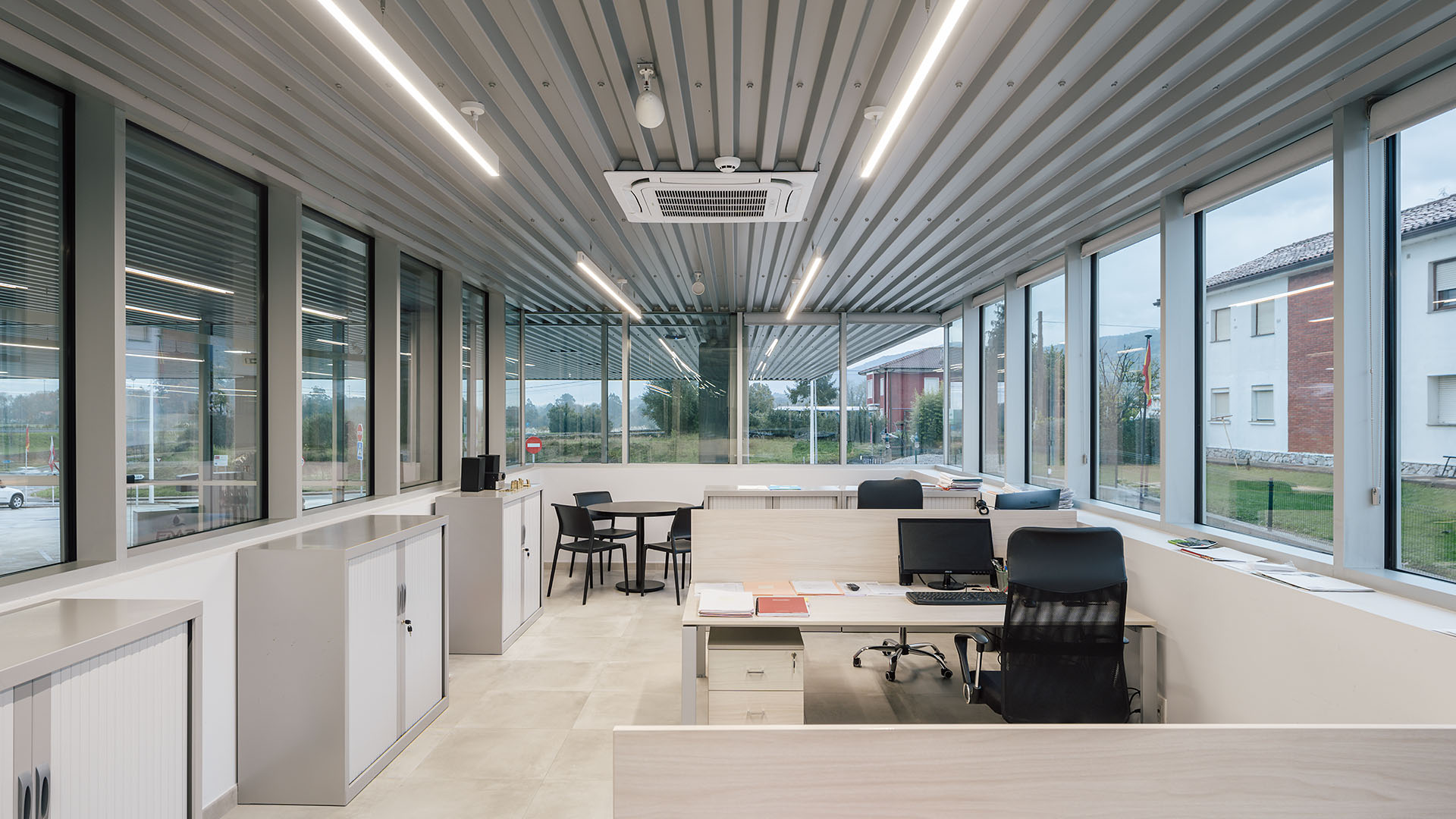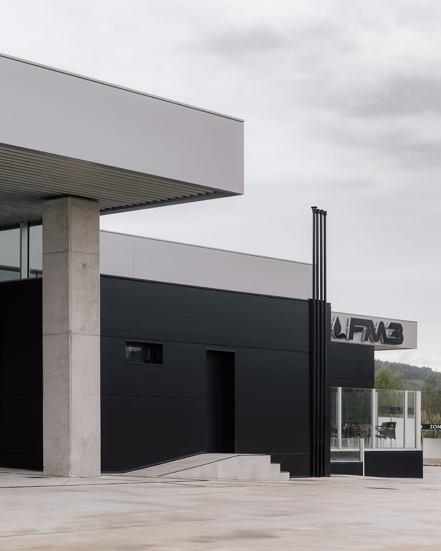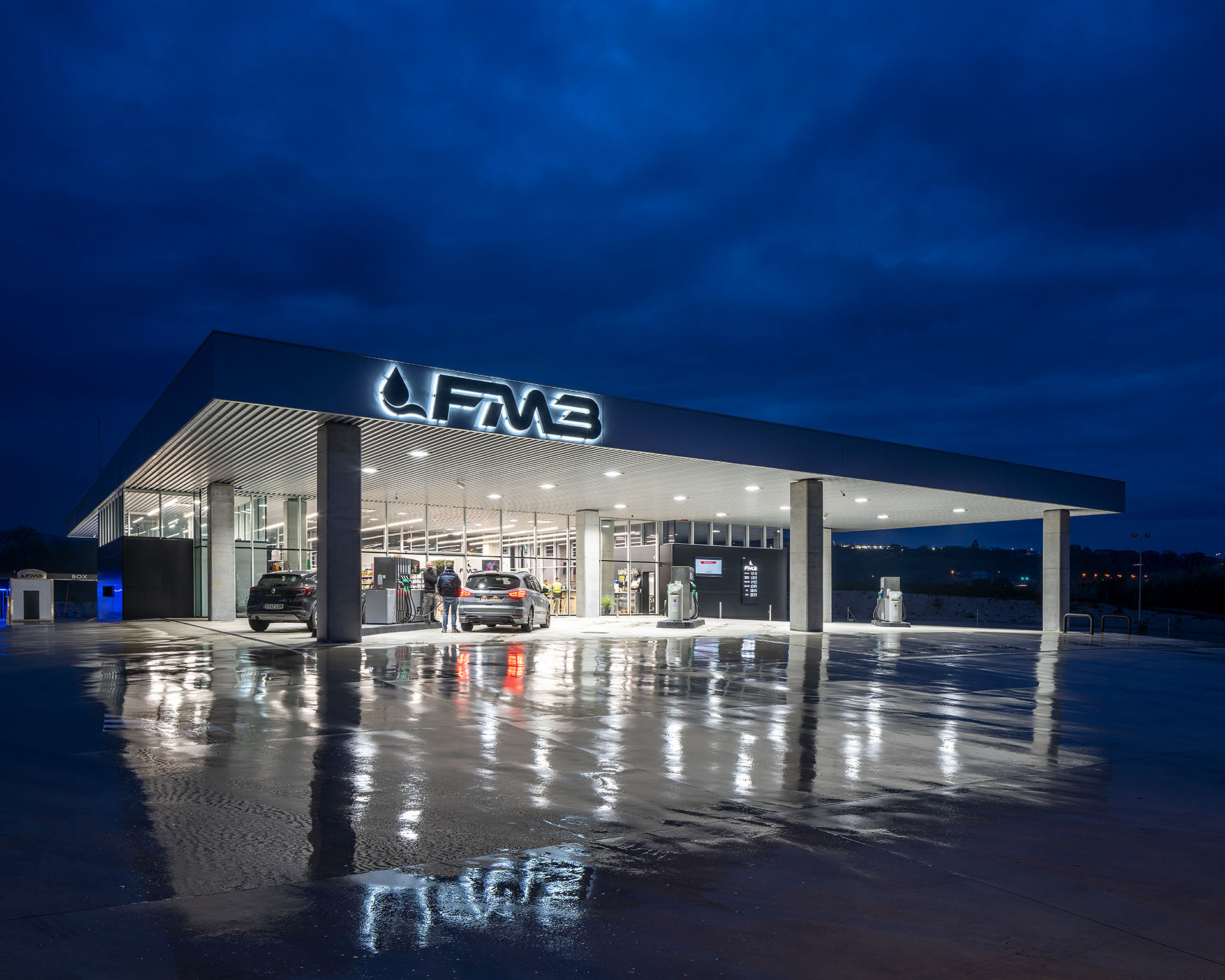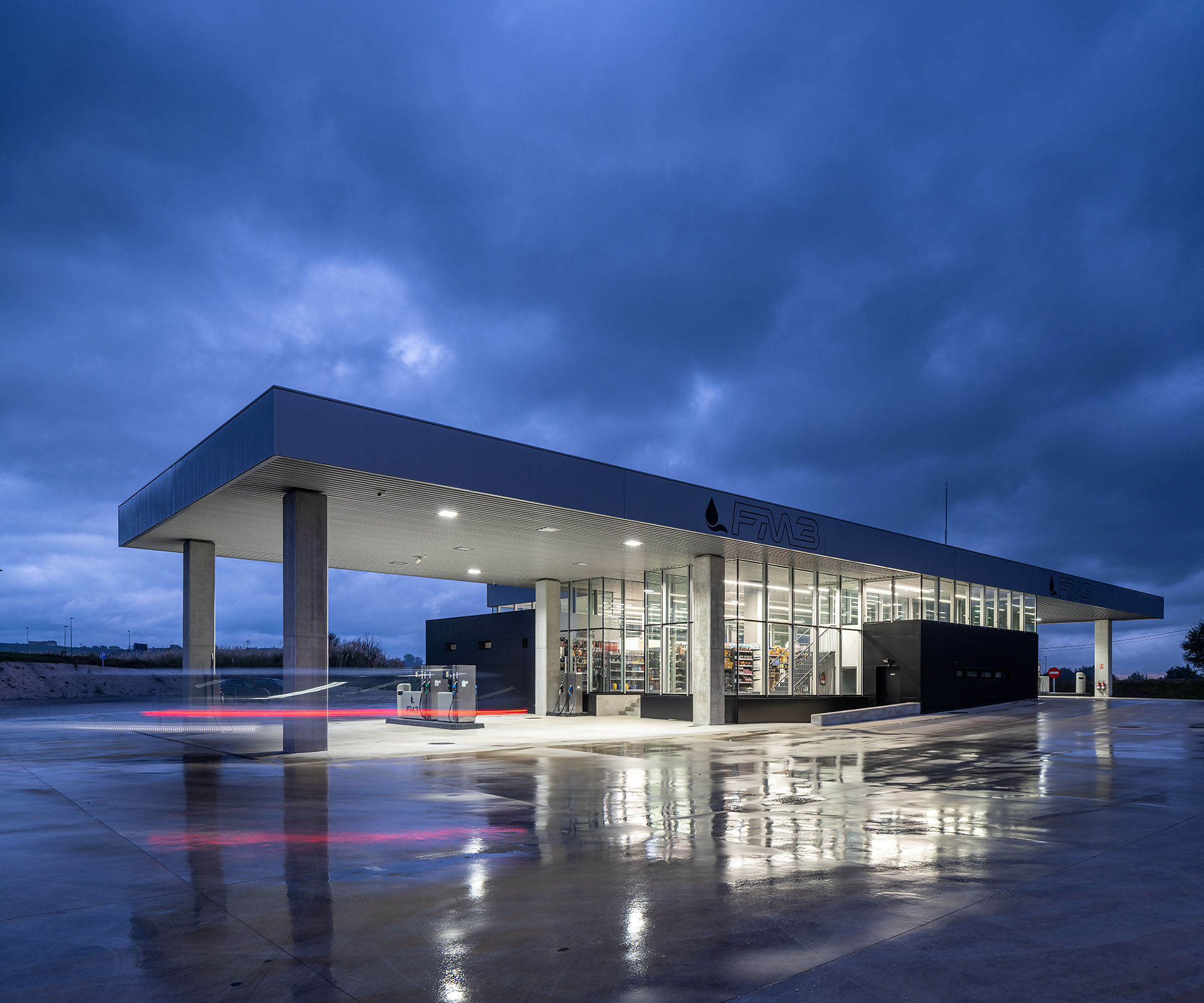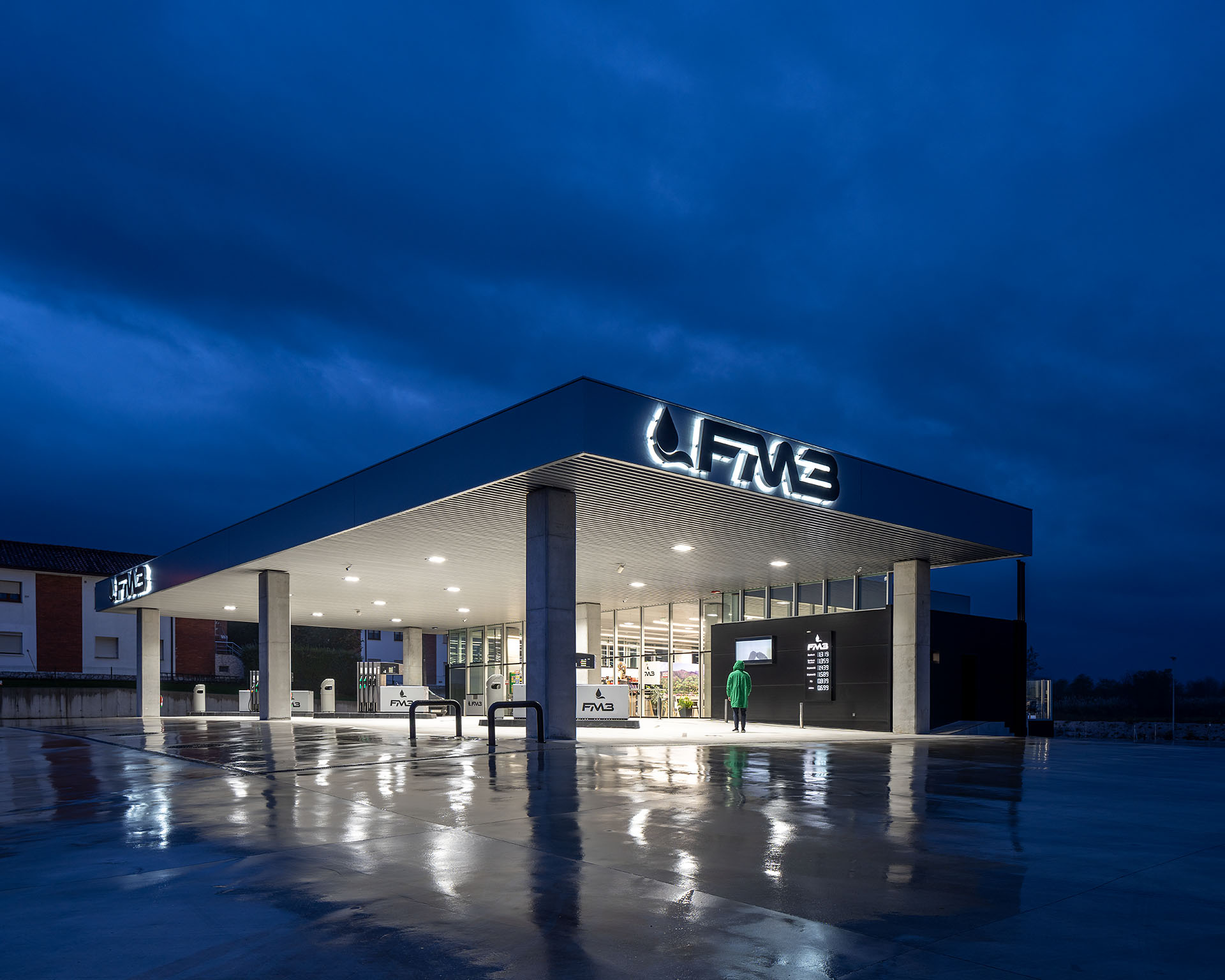 En el área central de la cubierta se organizan todas las piezas de servicios. El espacio principal viene definido por cuatro fachadas de muro cortina que buscan desmaterializarse y fundir el interior con el entorno, que cuenta vistas al paisaje natural que rodea en gran medida la gasolinera. En este volumen de vidrio se insertan tres cajas opacas que albergan servicios tales como aseos, cocina, instalaciones o almacén. Dos de ellas, se definen como volúmenes independientes con respecto a la cubierta principal y en sus techos se ubican lucernarios que permiten iluminar y ventilar de manera natural estas estancias. Sobre la caja ubicada en fachada sur, se integran las oficinas del conjunto a modo de panóptico, permitiendo vigilar todos los espacios del conjunto. Los volúmenes de cocina y almacén también cuentan con accesos independientes desde el exterior, lo que permite la descarga de producto de tienda y cafetería sin interferir con las circulaciones de los clientes. La caja de vidrio, con una altura libre de 4 metros, se organiza mediante el mobiliario articulando dos espacios; tienda y cafetería. Vinculada a la cafetería, una terraza permite hacer uso del exterior y desde la misma también se posibilita la entrada al edificio. Con esta solución, se define un total de tres accesos para clientes; desde terraza y desde ambas zonas de repostaje.