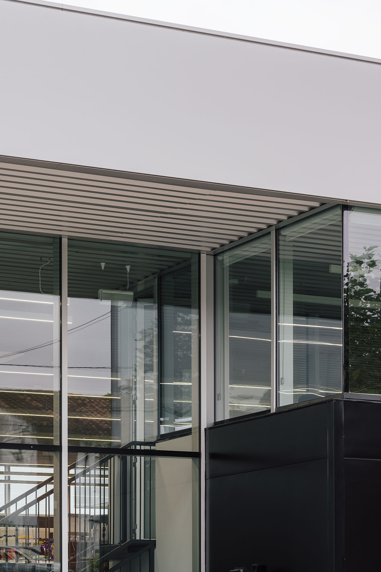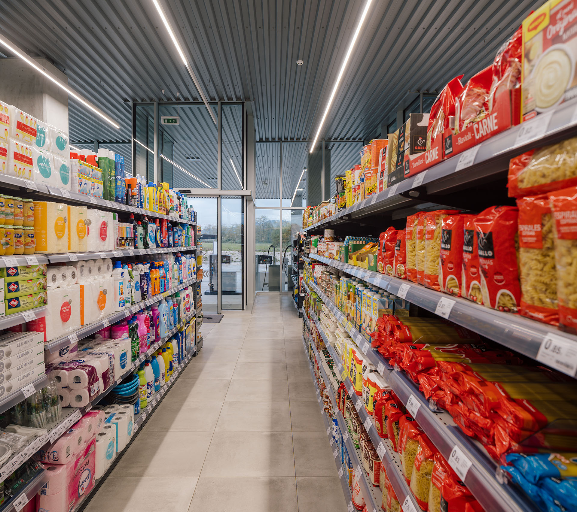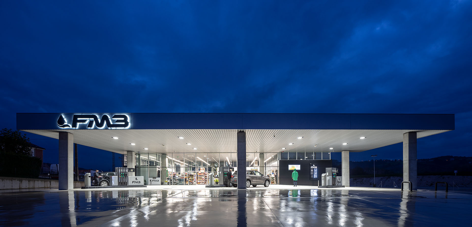 El proyecto de iluminación tiene como objetivo convertir toda la pieza en una gran lámpara, visible incluso desde la autovía. Con esta solución se evita que su presencia durante la noche dependa de letreros luminosos y se recupera y refuerza la condición de transparencia que articula el proyecto. Se define una imagen nocturna de colores fríos que contrastan con los coloridos productos de tienda y el mobiliario de madera de la cafetería.