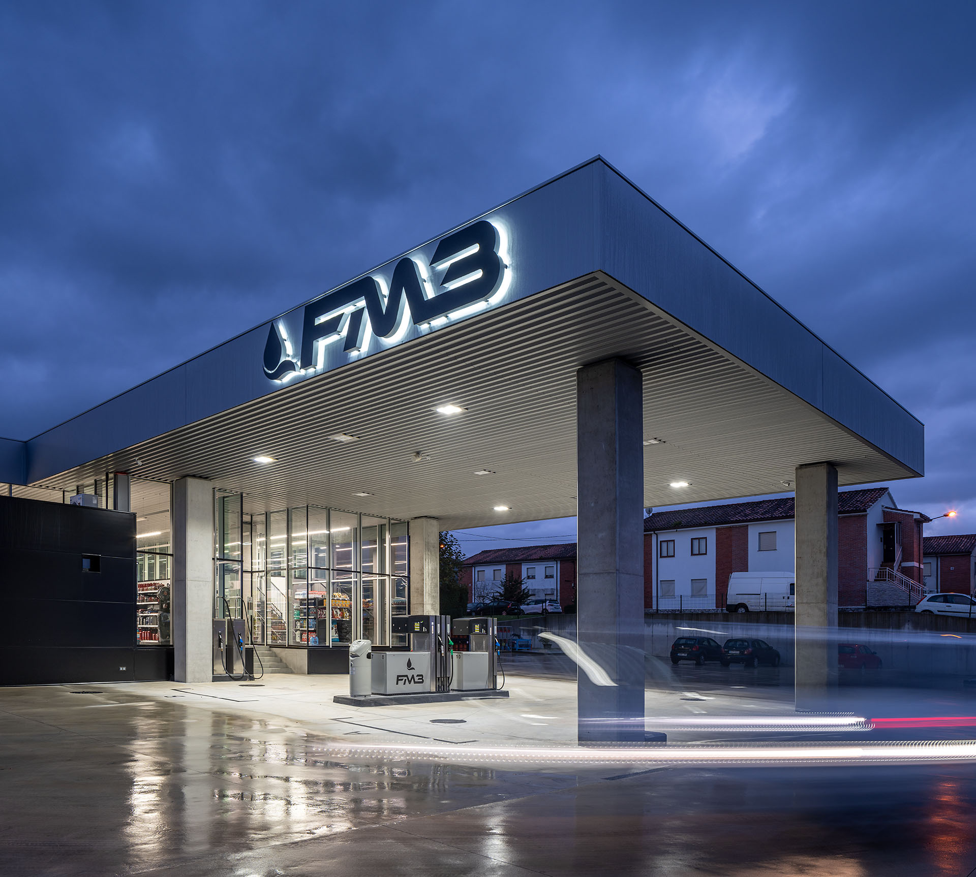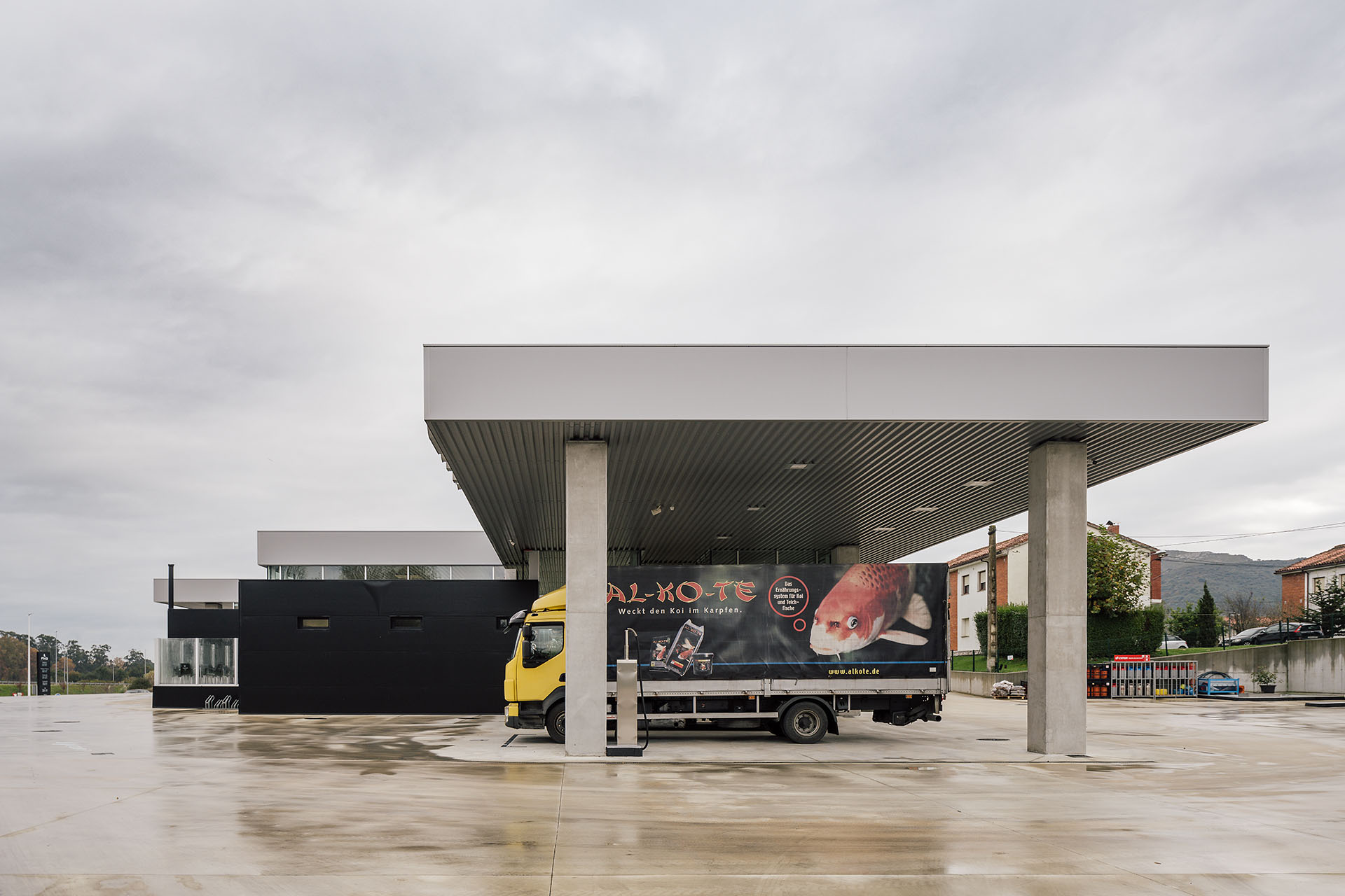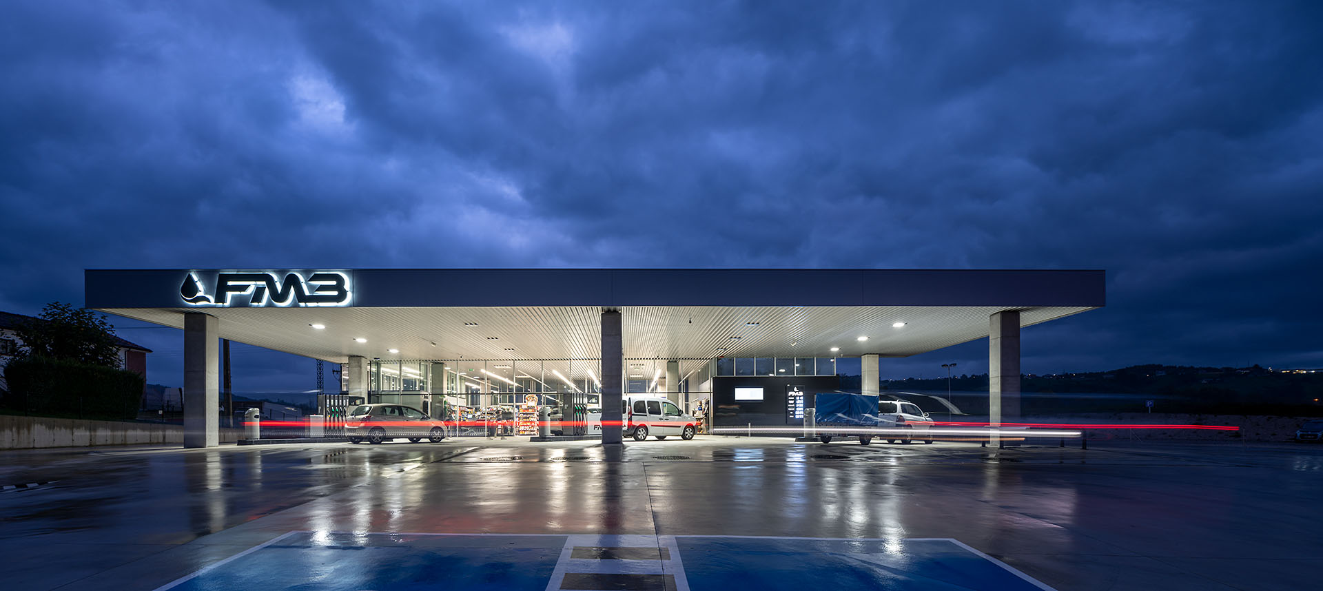 En base a estas premisas, se define una gran cubierta horizontal bajo la cual se organizan tres sectores; respostaje de coches, servicios y respostaje de camiones o vehículos de gran tamaño. A nivel de suelo, se aprovecha el desnivel descendente de la parcela en dirección este-oeste y se modela mediante un importante movimiento de tierras que busca la continuidad del plano horizontal. Con esta operación, se consigue que las dos áreas de repostaje tengan distintas alturas libres, aprovechando la mayor para la zona de camiones en orientación oeste. Con esta solución, la cubierta se ubica a una cota inferior con respecto a las edificaciones colindantes, y con ello se consiguen preservar las vistas de las que siempre han disfrutado los vecinos.