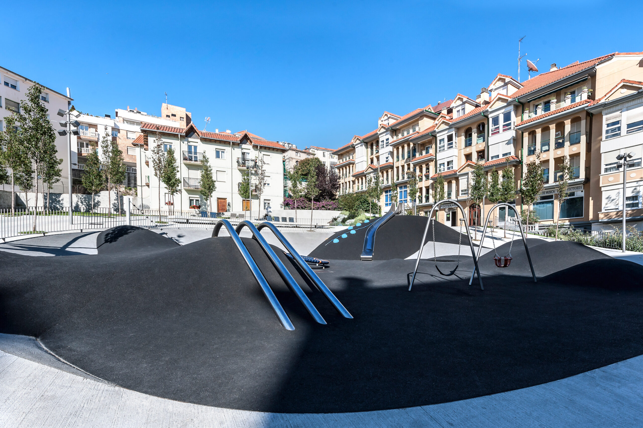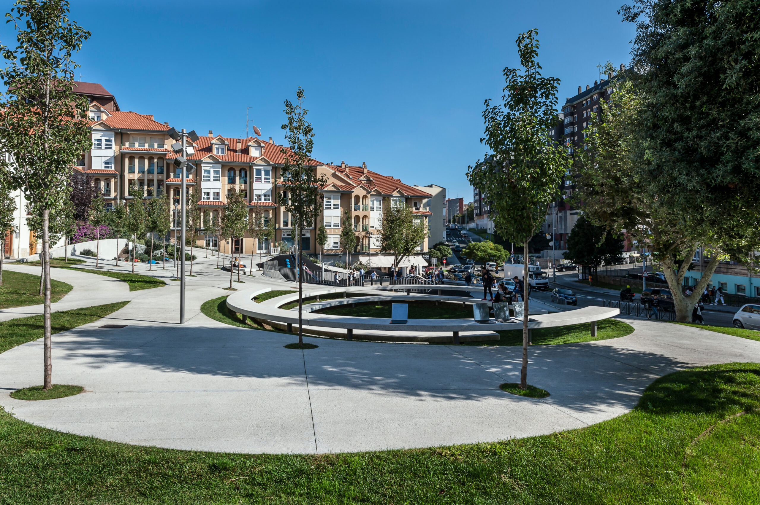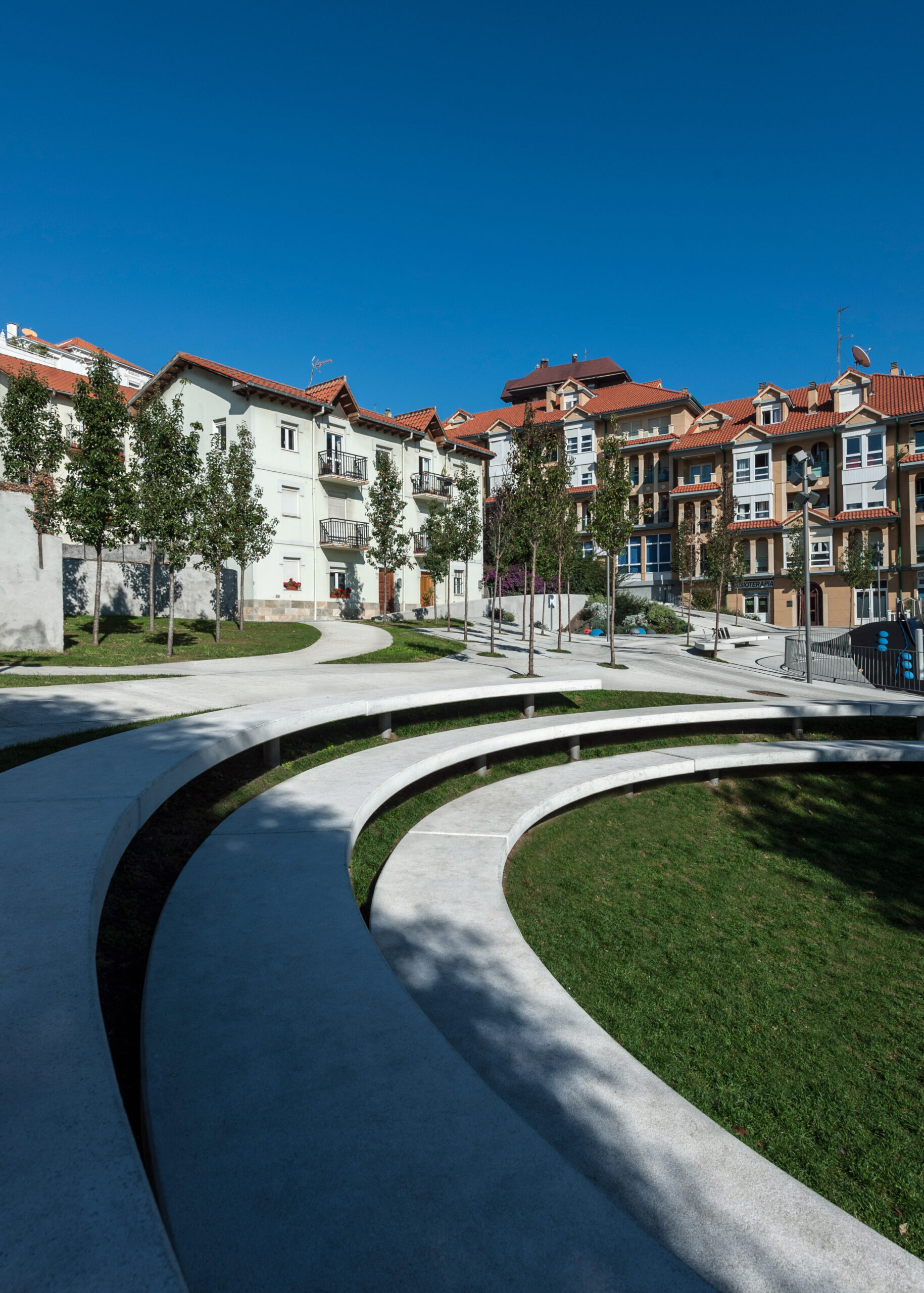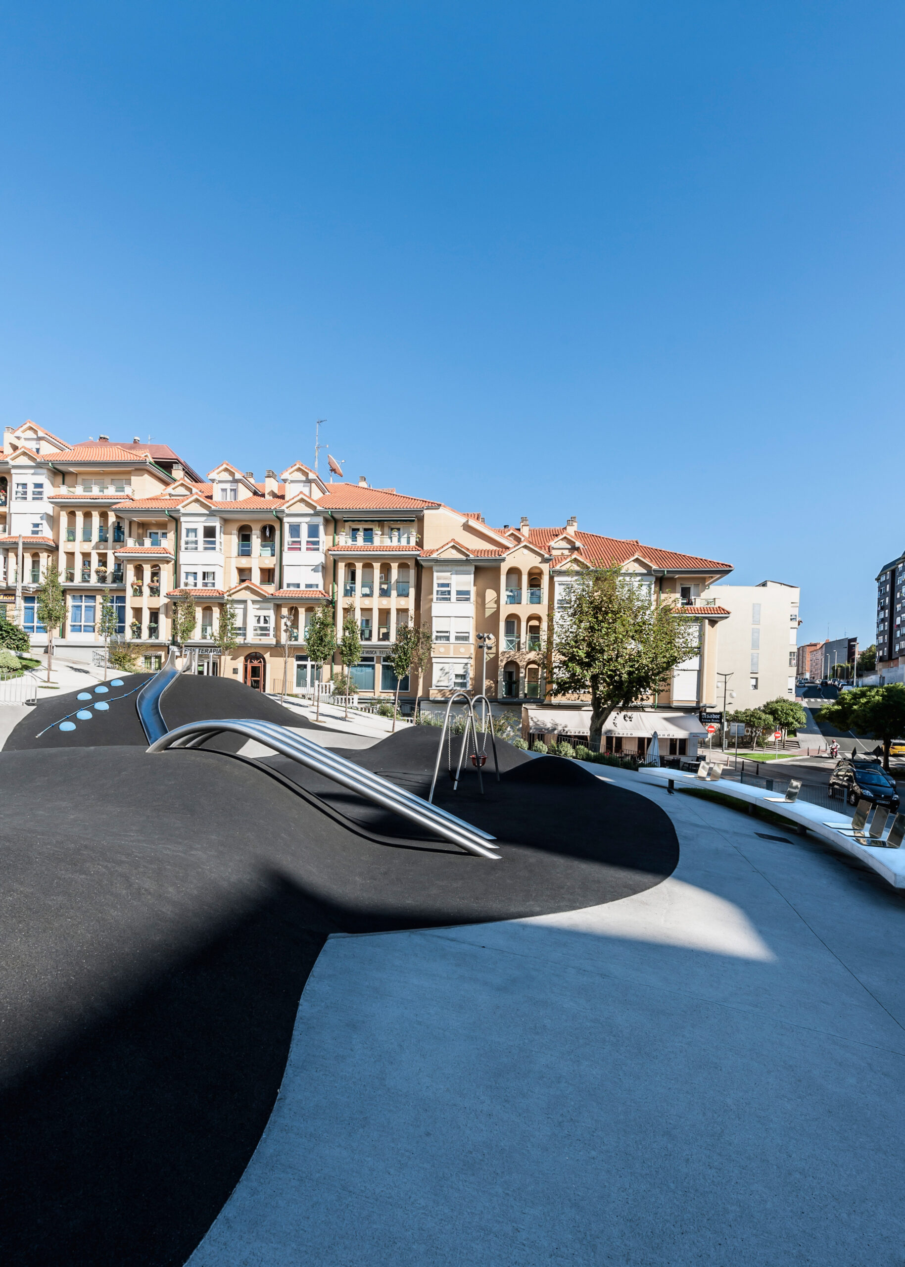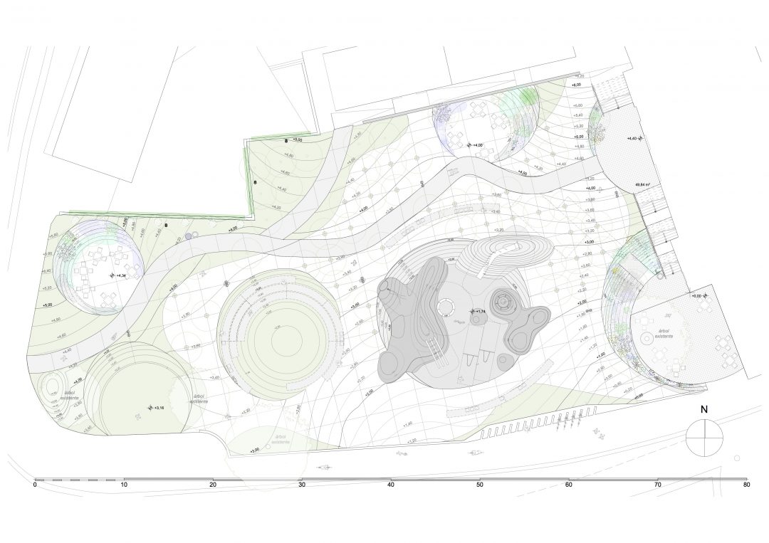 Se ha trabajado con un plano de suelo esculpido a modo de topografía, que consigue en su solución formal generar itinerarios accesibles a las zonas más altas de la plaza evitando rampas y barandillas. Para ello, se ha proyectado un plano regulador que busca en su geometría (una superficie reglada como plano base) la solución más sencilla, con unas pendientes mínimas que permiten cumplir accesibilidad. A este plano se le aplican unas acciones que van a tener como resultado una zonificación de la plaza a modo de “cráteres” que organizan actividades y circulaciones. Se quiere obtener una relación visual entre todas las partes del conjunto, pero permitiendo el desarrollo particular de cada una de las actividades. Estos cráteres se materializan de muy distintas maneras en función de su uso; se plantean suelos duros para las zona de terrazas (para negocios hosteleros ya existentes) con vegetación arbustiva en sus taludes, suelos de caucho en el parque infantil, otros de césped o uno de ellos ocupado por una instalación a modo de graderío reversible.