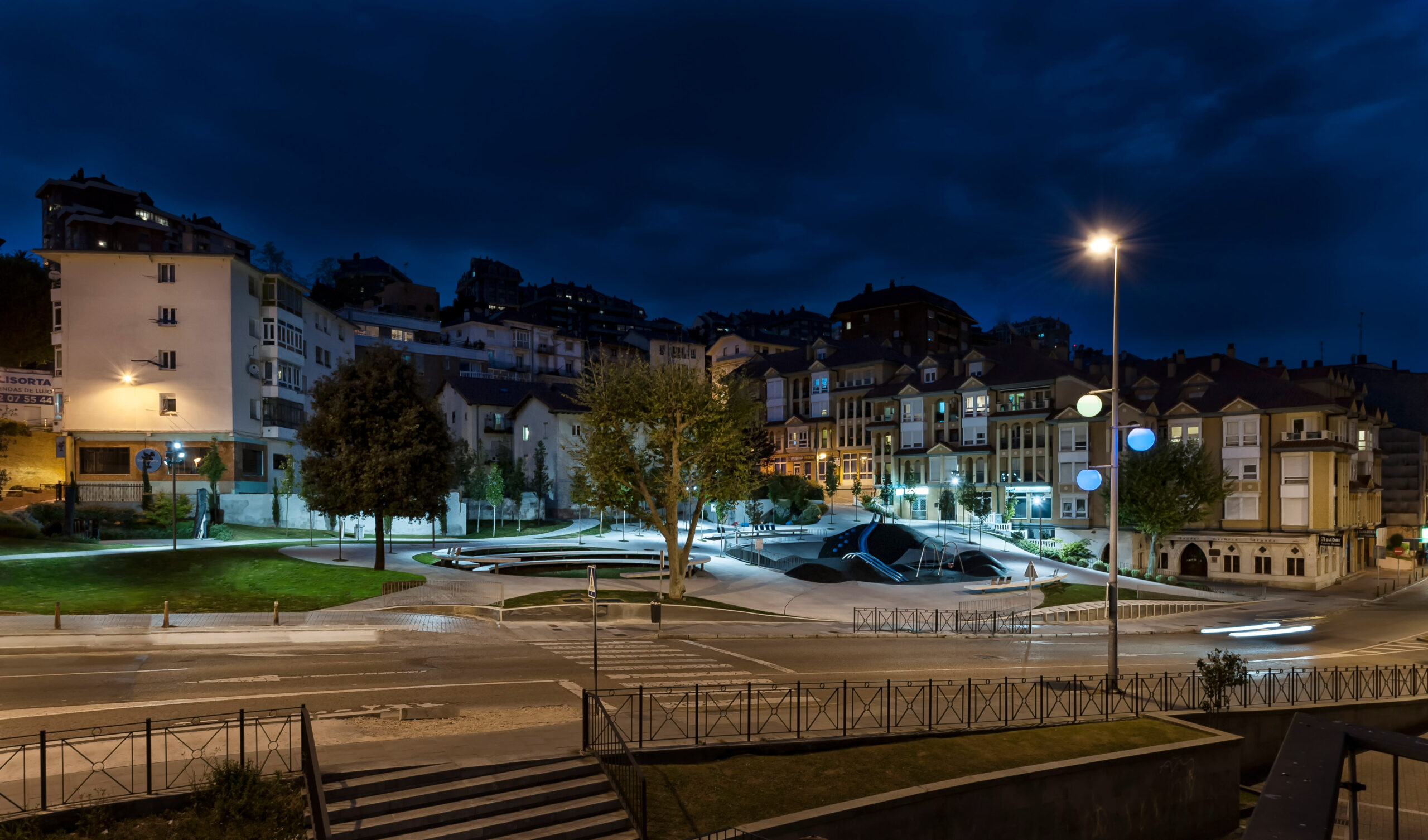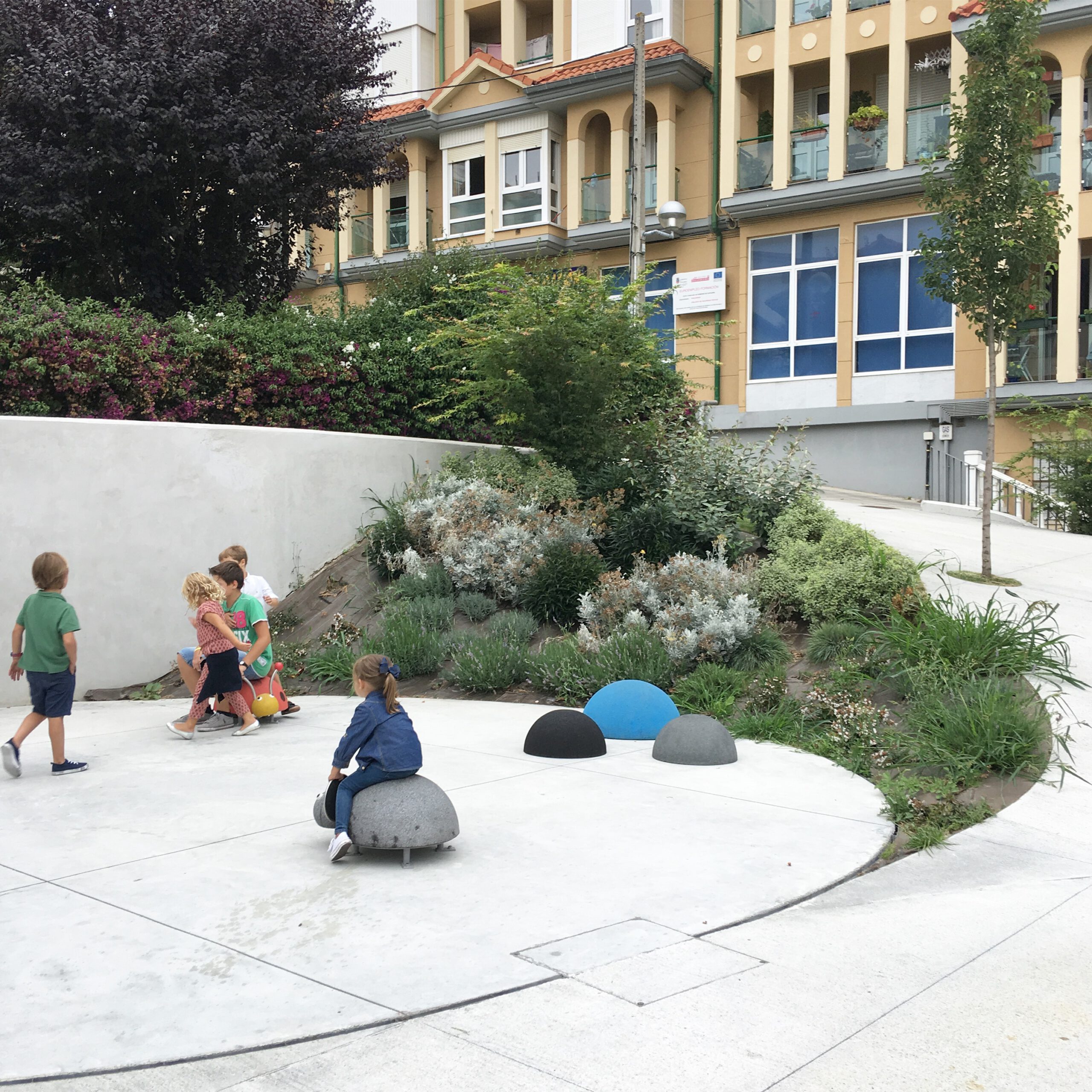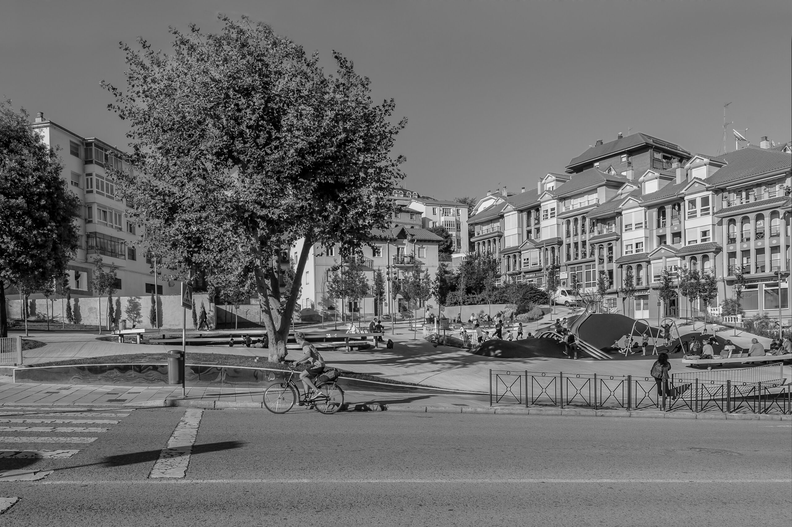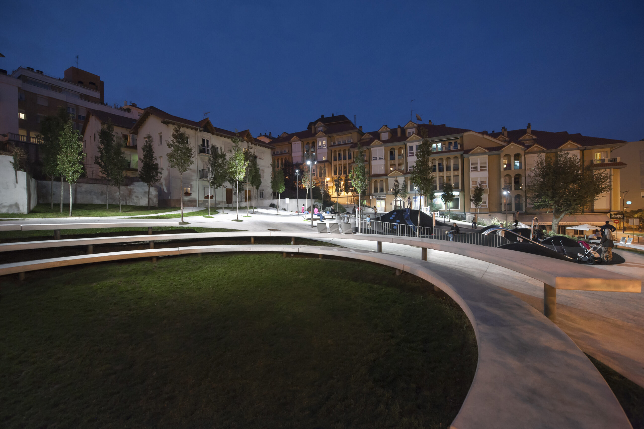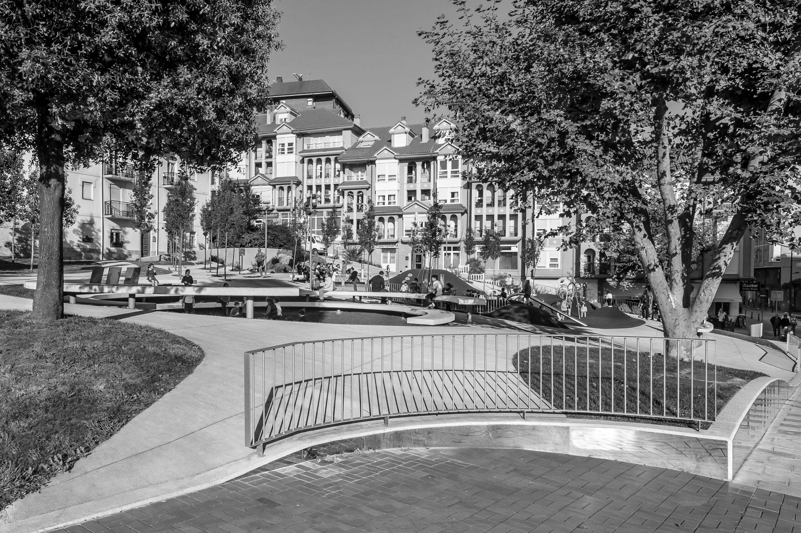 Se ha trabajado con un plano de suelo esculpido a modo de topografía, que consigue en su solución formal generar itinerarios accesibles a las zonas más altas de la plaza evitando rampas y barandillas. Para ello, se ha proyectado un plano regulador que busca en su geometría (una superficie reglada como plano base) la solución más sencilla, con unas pendientes mínimas que permiten cumplir accesibilidad. A este plano se le aplican unas acciones que van a tener como resultado una zonificación de la plaza a modo de “cráteres” que organizan actividades y circulaciones. Se quiere obtener una relación visual entre todas las partes del conjunto, pero permitiendo el desarrollo particular de cada una de las actividades. Estos cráteres se materializan de muy distintas maneras en función de su uso; se plantean suelos duros para las zona de terrazas (para negocios hosteleros ya existentes) con vegetación arbustiva en sus taludes, suelos de caucho en el parque infantil, otros de césped o uno de ellos ocupado por una instalación a modo de graderío reversible.