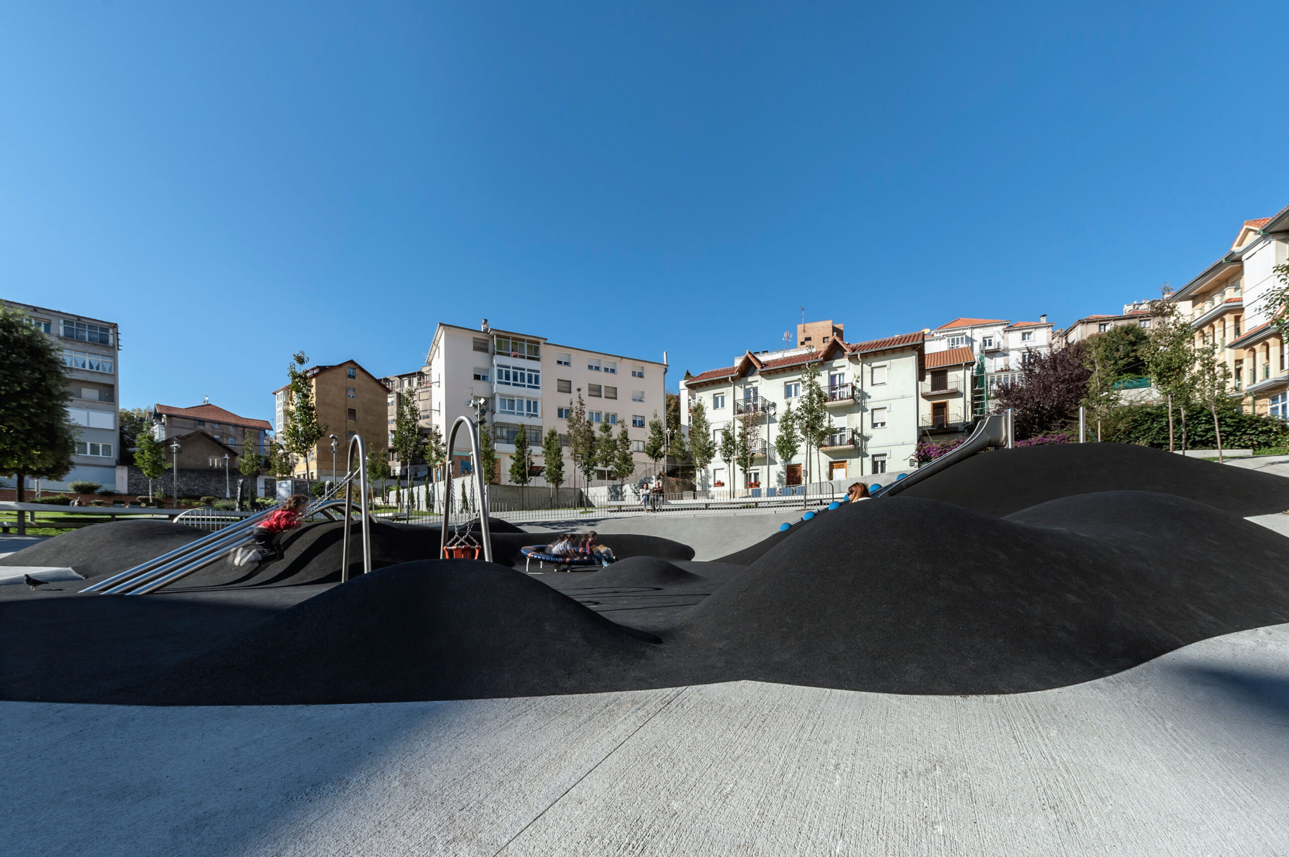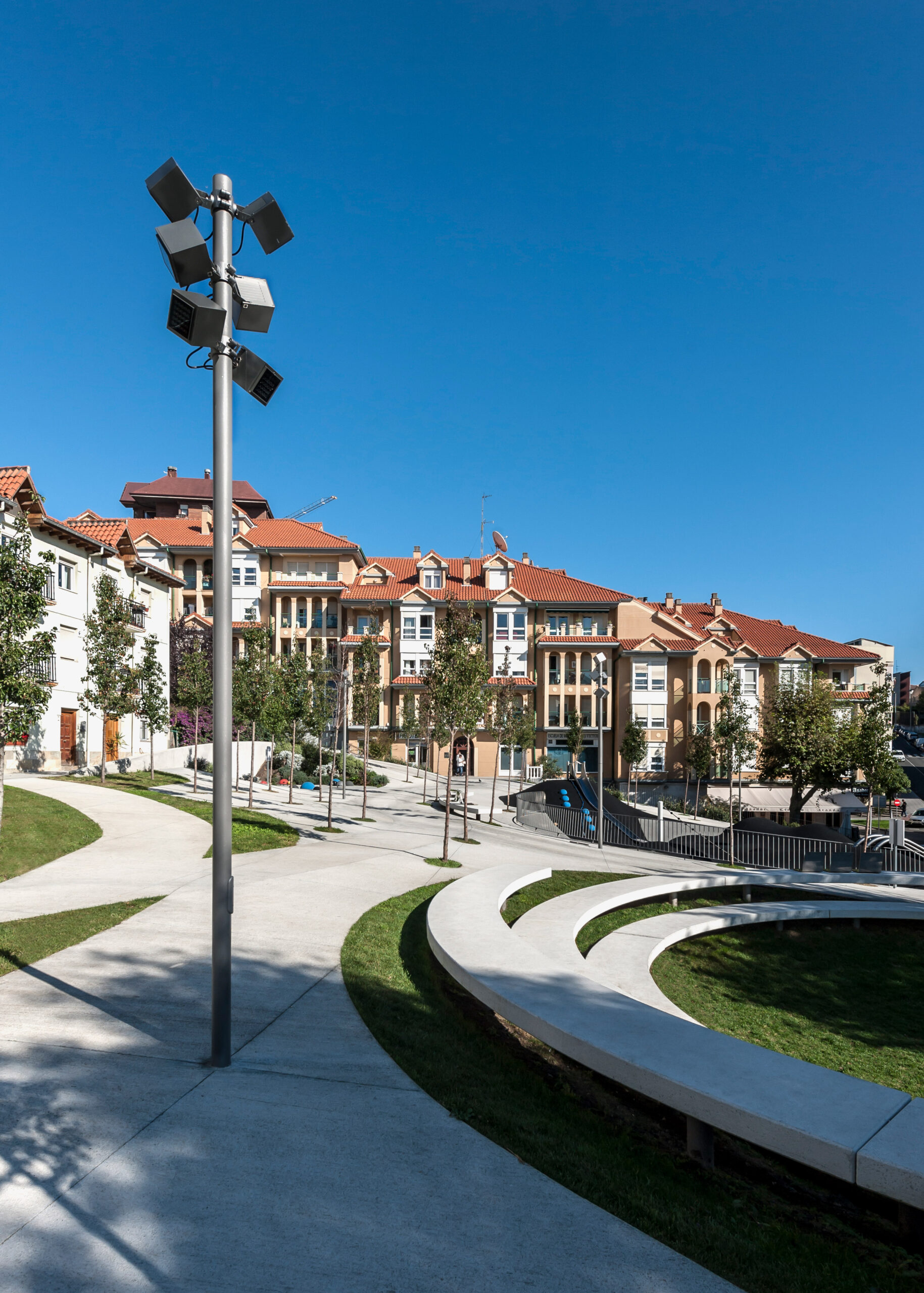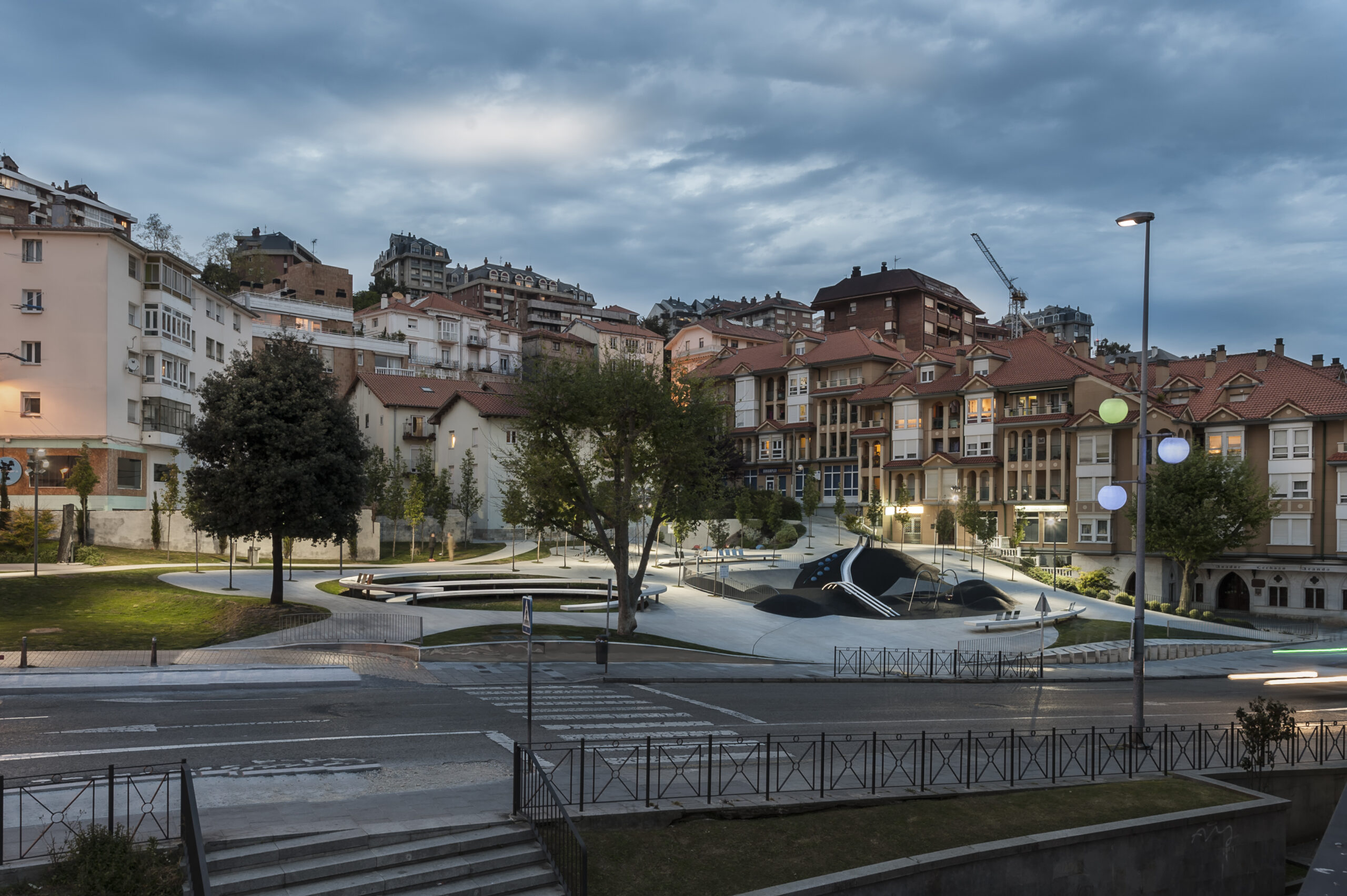 “Entre Valles y Cráteres” (lema para el concurso) ha buscado desde sus primeros esbozos generar un espacio público capaz de crear un plano continuo de suelo que consiga salvar el gran desnivel que presentaba el área de trabajo (6,20 metros de altura en la parte más desfavorable). Haciendo utilizable el 100% de su superficie y, recuperando así un espacio residual de la ciudad en el que se habían yuxtapuesto una serie de operaciones independientes, tales como la creación de un aparcamiento, la instalación de un generador eléctrico, o una rampa para dar acceso a las viviendas en las zonas más elevadas.