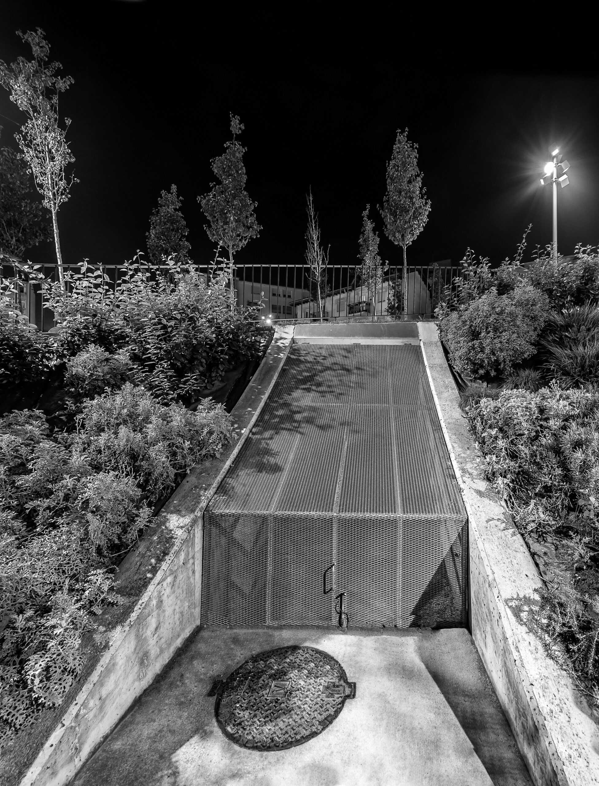 Sobre el proyecto se superpone una trama de 3×3 metros que sirve de base reguladora para organizar la ubicación de árboles “pyrus calleryana», iluminación con báculos y proyectores, y demás mobiliario urbano. También es esta trama la que define las juntas de dilatación que formarán parte del despiece del suelo de hormigón rayado, cuya textura garantiza la nula resbaladicidad .